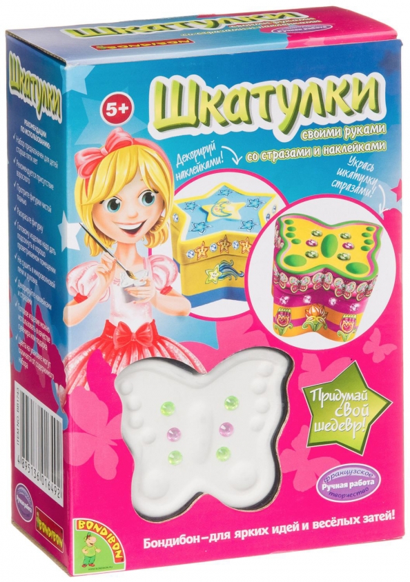 В наборе: шкатулки, краски, кисть, наклейки, стразы.