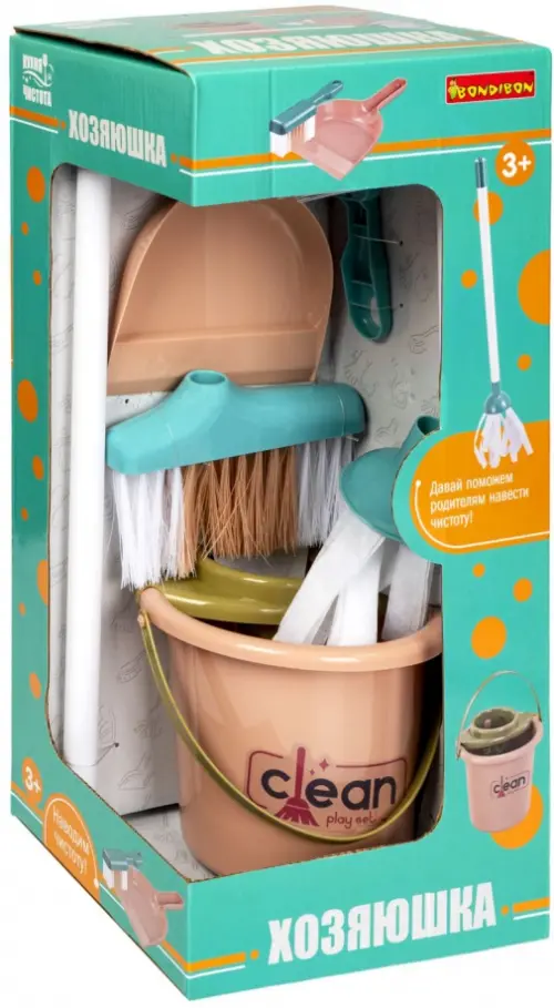 Набор " Хозяюшка " состоит из 7 предметов. В него включены все нужные аксессуары для уборки - ведро, швабра, щетка, совок, средство для удаления грязи и мытья, губка.