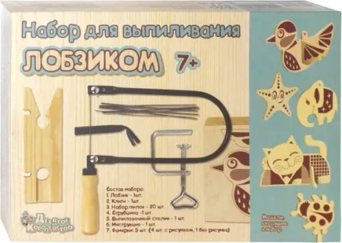 В состав набора входит: лобзик - 1 штука, ключ для барашковой гайки - 1 штука, набор пилок - 20 штук, струбцина - 1 штук, выпиловочный столик - 1 штук, фанерки, размером 210x150x4 мм - 5 штук (с рисунком - 4 штуки, без рисунка - 1 штука), инструкция.