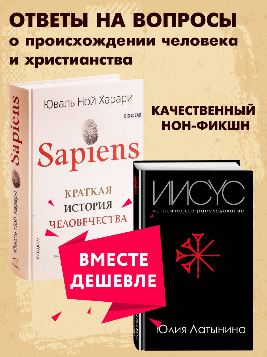 Книга 1. SAPIENS. Краткая история человечества Сто тысяч лет назад Homo sapiens был одним из как минимум шести видов человека, живших на этой планете, - ничем не примечательным животным, которое играло в экосистеме роль не большую, чем гориллы, светлячки или медузы. Но около семидесяти тысяч лет назад загадочное изменение когнитивных способностей Homo sapiens превратило его в хозяина планеты и кошмар экосистемы… Книга 2. Иисус. Историческое расследование Иисус Христос был. Сам факт его существования не выдумка, не миф. Его существование доказывает множество документов. Но насколько реальный Иисус соответствовал образу, старательно создававшемуся библеистами в течение без малого двух тысяч лет?| Издательство | Синдбад Издательство ООО |
