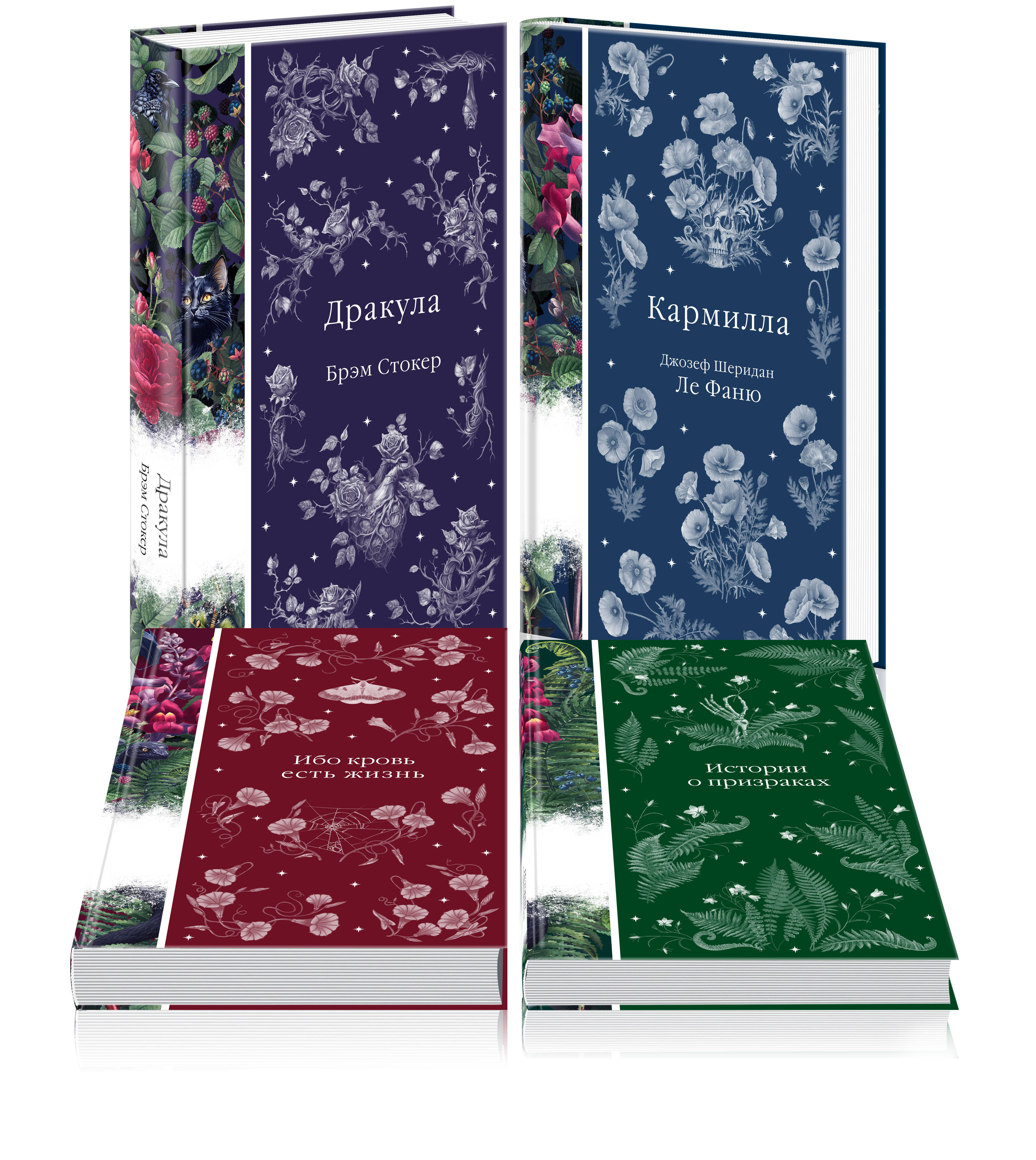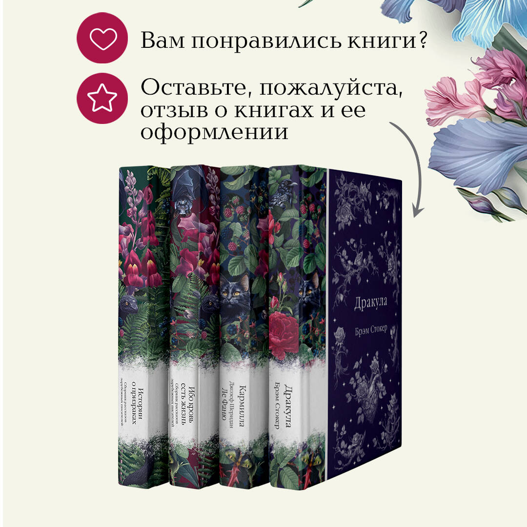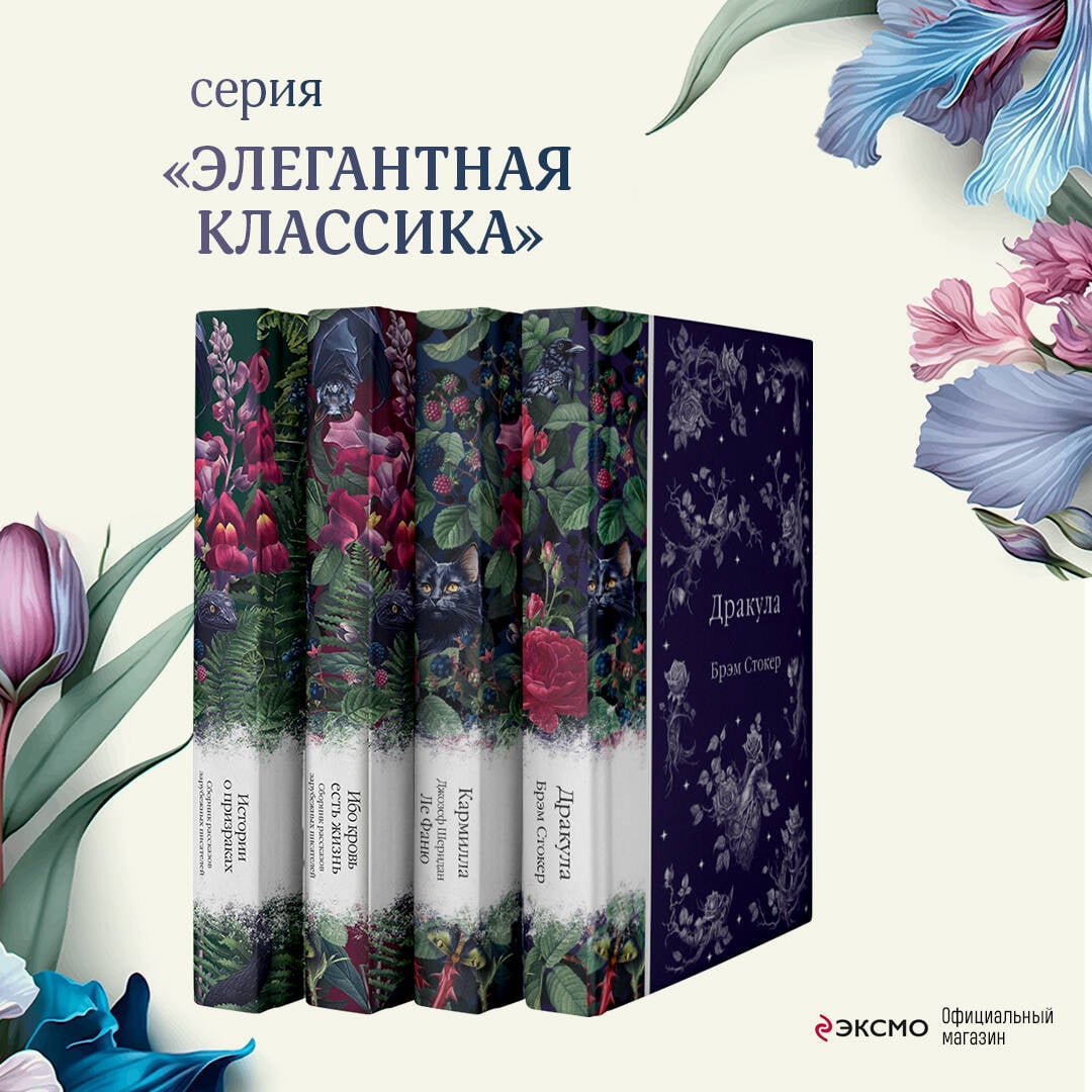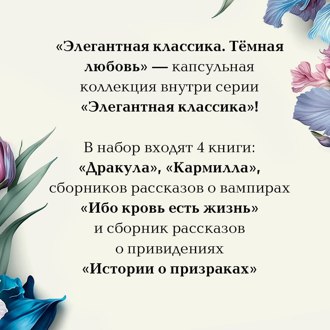 В комплект входят 3 книги: «Дракула», «Кармилла», сборников рассказов о вампирах «Ибо кровь есть жизнь» и сборник рассказов о привидениях «Истории о призраках». 2 романа и 36 рассказов. «Элегантная классика. Тёмная любовь» - капсульная коллекция внутри серии «Элегантная классика»! Любовь многогранна, может вознести, а может разбить сердце. Любовь может идти рука об руку с притягательной тьмой, манящей в потусторонние миры. Поэтому в привычный макет серии мы добавили темные краски, убийственно красивые цветы, а также животных-проводников. Капсулу объединяет общая тематика мистического и картинка на корешке, внутри макет с иллюстрациями. «Дракула», «Кармилла» и сборник «Ибо кровь есть жизнь» объединены общей темой вампиризма. Всего два столетия назад вампиры перекочевали из области легенд и преданий в мир художественной литературы и превратились за это время в популярнейших героев современной культурной мифологии. Обитающие в древних замках, богатых дворцах и скромных сельских хижинах, прибывающие из дальних стран, восстающие из могил и сходящие со старинных портретов, загадочные, жестокие, аристократичные, одержимые жгучими страстями и бесстрастные, как сама смерть, они вновь и вновь устремляются на поиски своего странного бессмертия - ведомые жаждой крови, с отсветами вечности и ада в голодных глазах… О феномене вампиризма повествуют Б. Стокер, Дж.Ш. Ле Фаню, Дж. У. Полидори, Л. фон Захер-Мазох, Дж. Готорн, Э. Несбит, Э. Ф. Бенсон и другие авторы. Сборник «Истории о призраках» - XIX век и начало ХХ-го - эпоха расцвета жанра страшного рассказа в литературе Старого и Нового света. В оригинальном сборнике «Истории о призраках» мистические рассказы европейских и американских авторов о представителях потустороннего мира - призраках: ужасающие призраки и их несчастные жертвы, любовь, продолжающаяся после смерти, благородные привидения-спасители и прочие таинственные истории. О драматичных, подчас смертельно опасных столкновениях обыденного и фантастически жуткого повествуют всемирно известные мэтры литературного мейнстрима (Генри Джеймс, Чарльз Диккенс, Джозеф Конрад), признанные мастера готической новеллистики (Джозеф Шеридан Ле Фаню, Амелия Эдвардс, Монтегю Родс Джеймс, Эдвард Фредерик Бенсон) и незаслуженно забытые ныне прозаики, такие как Эдит Уортон, Вернон Ли, Луиза Болдуин, Сэйбин Бэринг-Гулд, Персеваль Лэндон.