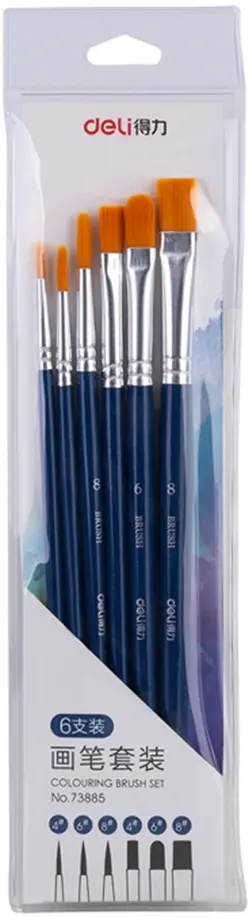 Набор кистей. Материал волоса: нейлон. Количество кистей в наборе: 6 кистей ( 3 плоские, 3 круглые). Размер кистей: плоские (№4, 6, 8), круглые (№4, 6, 8). Материал ручки: дерево с лакировкой. Сделано в Китае.