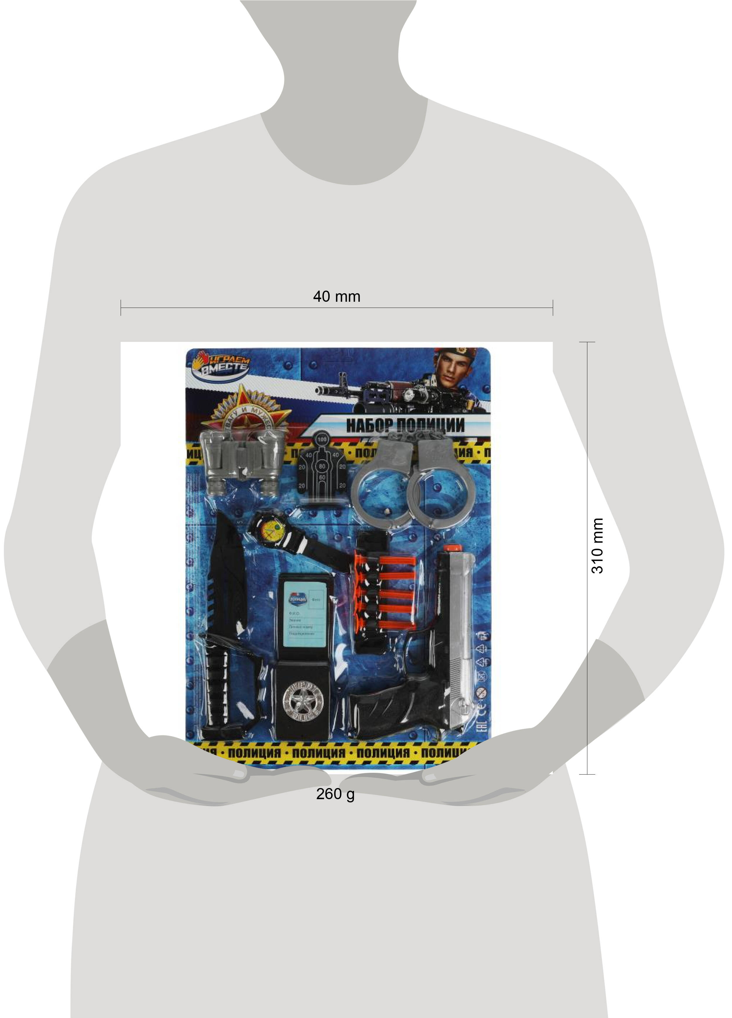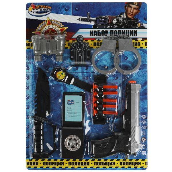 Игровой набор "Полиция" ТМ "Играем вместе" станет прекрасным подарком для юных защитников правопорядка: - реалистичный дизайн - удобная рукоять пистолета В комплекте: - пистолет - 5 пуль на присосках - бинокль - мишень - нож и др. С таким реалистичным игровым набором маленький герой будет придумывать увлекательные спецзадания, защищать мир и стоять на страже порядка. Подойдёт для активных игр на воздухе и в помещении. Игра с набором ТМ "Играем вместе" развивает: - воображение - внимание - моторику Размер упаковки: 21 х 31 х 3 см. Материал: пластмасса. Рекомендовано детям от 3-х лет.