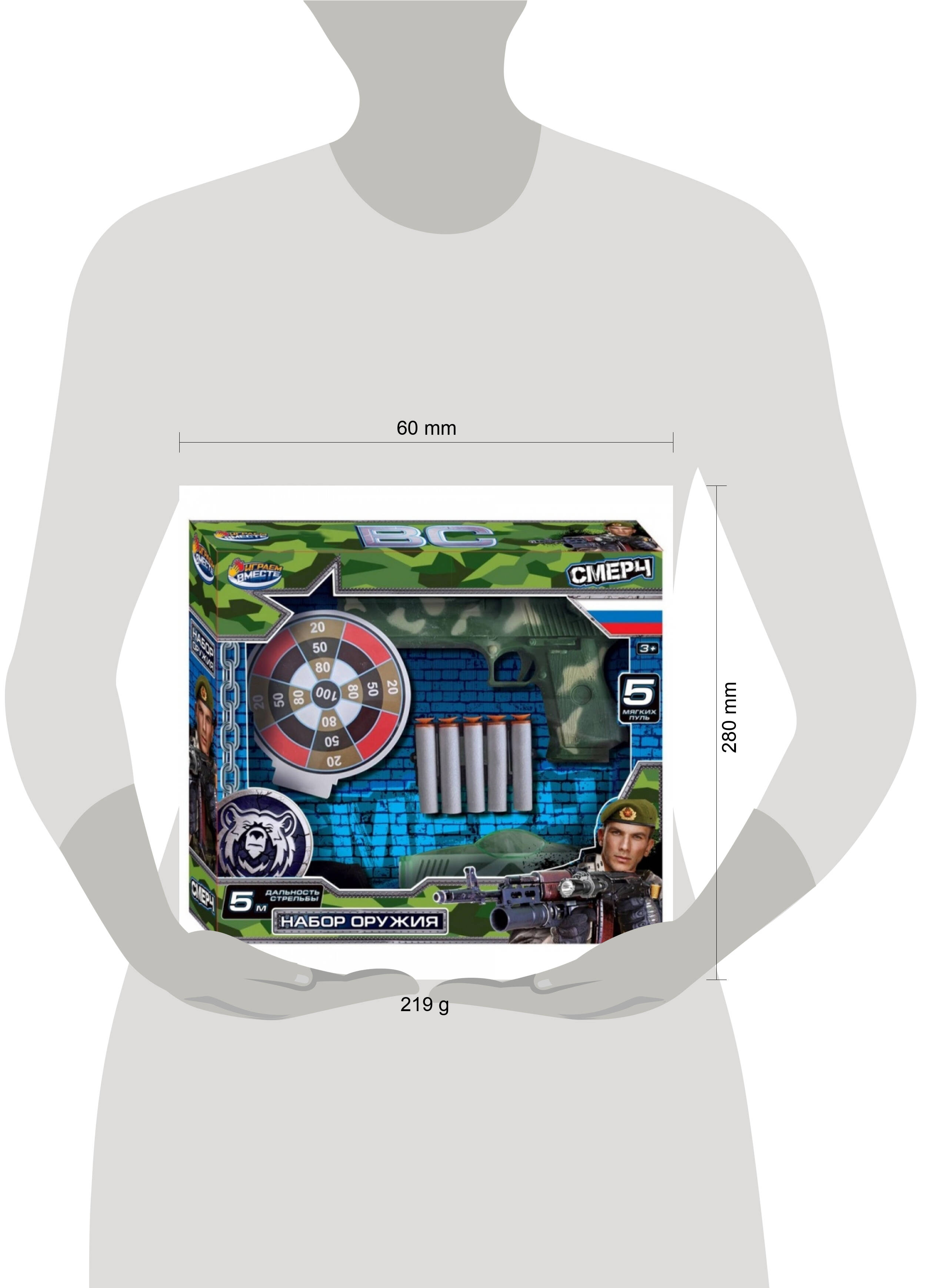 Набор оружия ТМ "Играем вместе" непременно понравится юному герою. В комплекте: - пистолет - 3 пуль на присосках - мишень С этим игровым оружием ваш ребёнок будет придумывать увлекательные спецзадания, защищать мир и стоять на страже порядка. С таким пистолетом маленький герой станет самым метким стрелком. Набор подойдёт для активных игр на воздухе и в помещении. Игры с оружием ТМ "Играем вместе" помогут развить: - координацию движений - воображение - ловкость и меткость - внимание - моторику Размер: 18 х 15 х 3 см. Материал: пластмасса. Рекомендовано детям от 3-х лет.| Издательство | С-Маркет ООО |