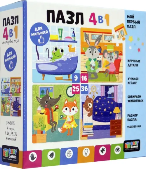Набор пазлов 4 в1 - это комплект пазлов с разной элементностью, включающий в себя головоломки из 9, 16, 25 и 36 элементов, объединенных общей тематикой. Постепенно усложняя сборку пазла от 9 элементов до 36 элементов, ребенок научится внимательности, концентрации, а также сможет развить мелкую моторику.