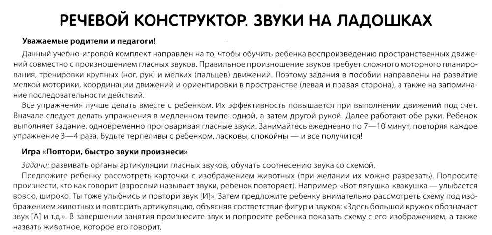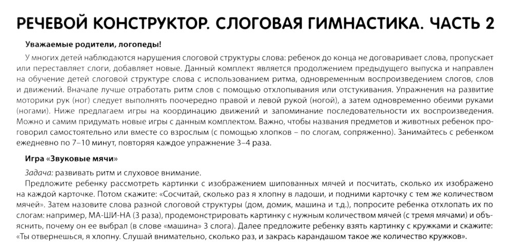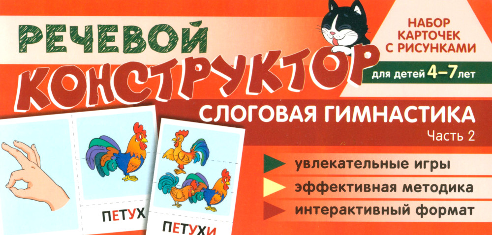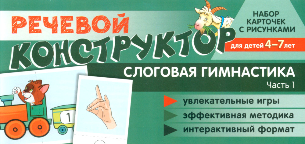 Комплект состоит из: • Набор карточек с рисунками. Речевой конструктор. Слоговая гимнастика. Часть 1. Для детей 4-7 лет. • Набор карточек с рисунками. Речевой конструктор. Слоговая гимнастика. Часть 2. Для детей 4-7 лет. • Набор карточек с рисунками. Речевой конструктор: Звуки на ладошках. Для детей 4-7 лет. • Набор карточек с рисунками. Речевой конструктор: Звуковая гимнастика. Для детей 4-7 лет. • Набор карточек с рисунками. Речевой конструктор: Подвижная гимнастика. Для детей 4-7 лет.| Издательство | Творческий центр Сфера |