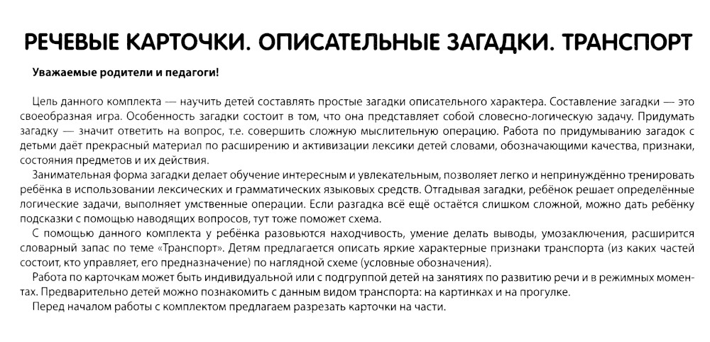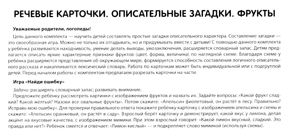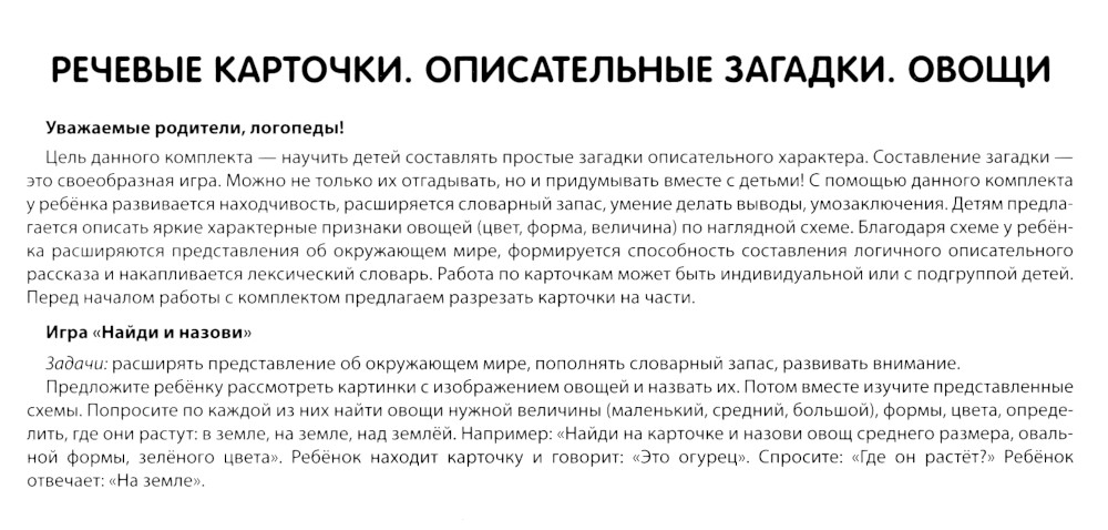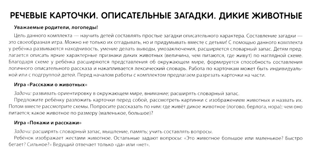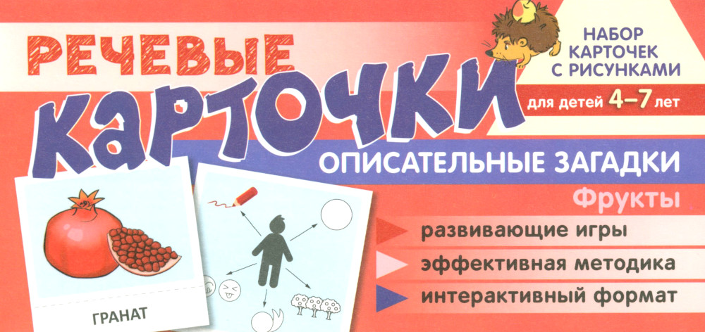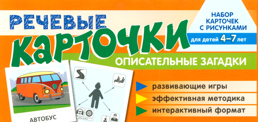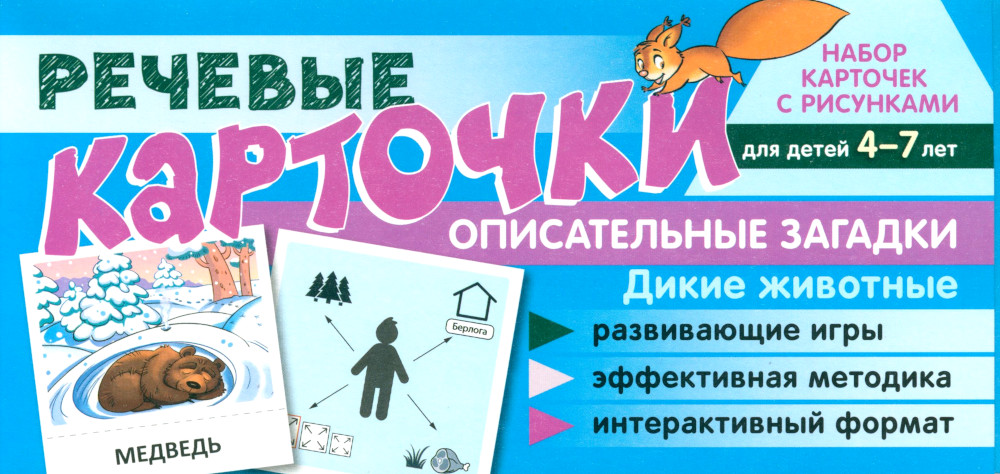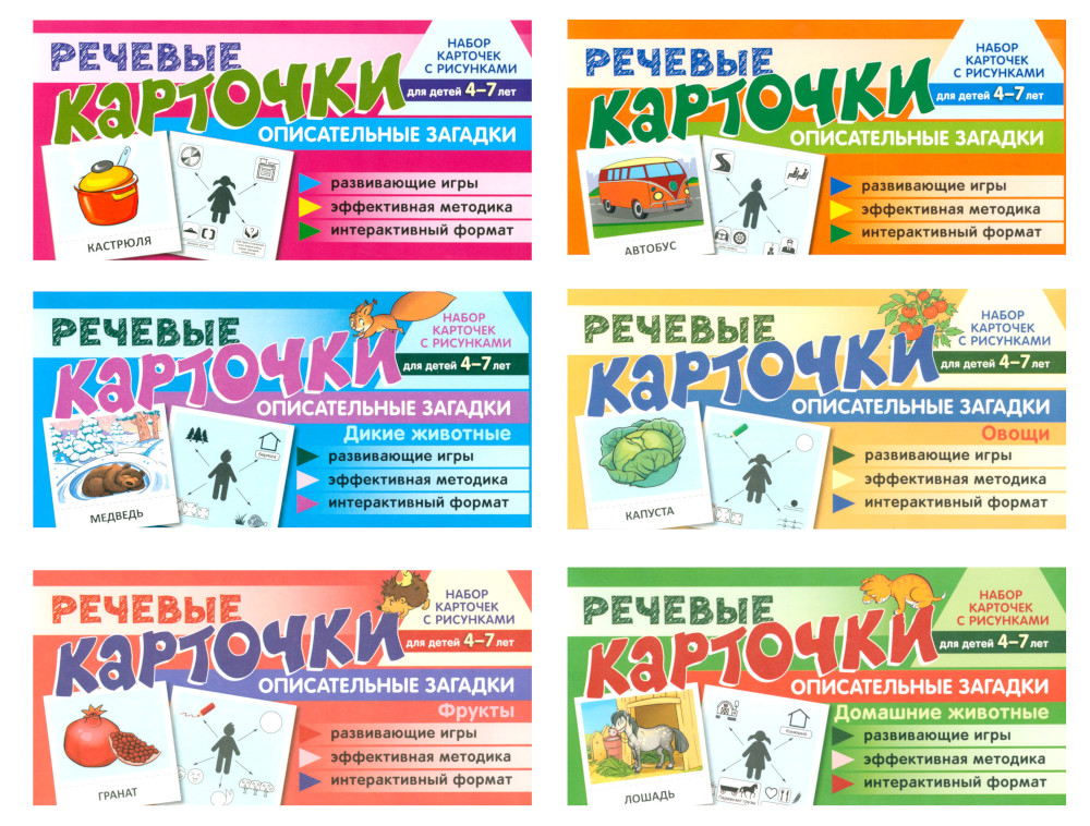 Комплект состоит из: • Набор карточек с рисунками. Речевые карточки. Описательные загадки. Дикие животные. Для детей 4-7 лет • Набор карточек с рисунками. Речевые карточки. Описательные загадки. Домашние животные. Для детей 4-7 • Набор карточек с рисунками. Речевые карточки. Описательные загадки. Овощи. Для детей 4-7 лет • Набор карточек с рисунками. Речевые карточки. Описательные загадки. Посуда. Для детей 4-7 • Набор карточек с рисунками. Речевые карточки. Описательные загадки. Транспорт. Для детей 4-7 лет • Набор карточек с рисунками. Речевые карточки. Описательные загадки. Фрукты. Для детей 4-7 лет| Издательство | Творческий центр Сфера |