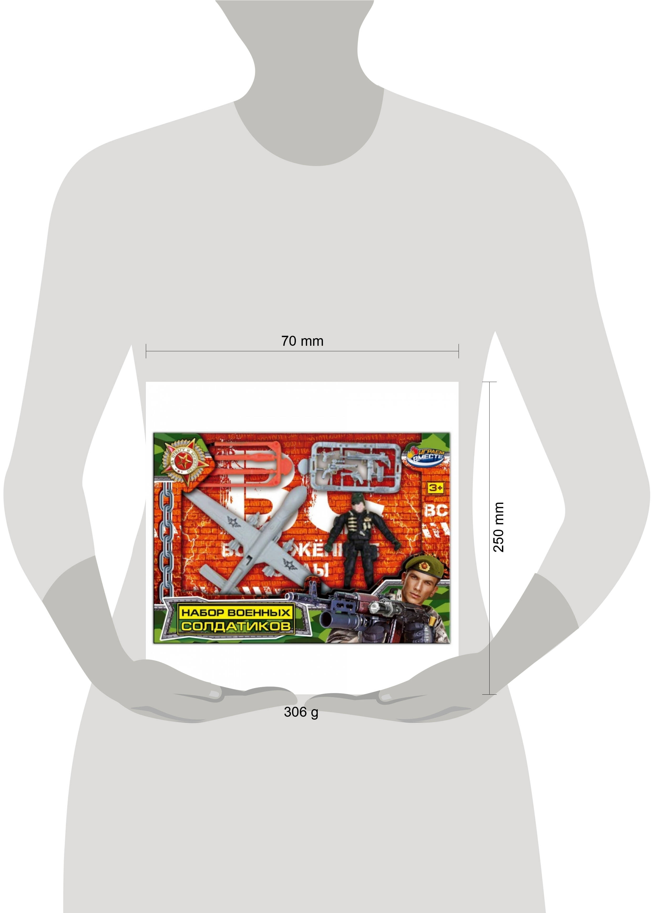 Набор военных солдатиков ТМ "Играем вместе" обязательно понравится юному герою: - подвижные руки и ноги В комплекте: - солдатика - оружие - самолёт Набор из солдатика с аксессуарами и разнообразным оружием позволит создать настоящие сцены спецопераций. Благодаря компактным размерам, набор можно брать с собой. Игра с набором солдатиков ТМ "Играем вместе" развивает: - мелкую моторику - воображение - внимание Размер игрушки: 15 х 13 х 5 см. Материал: пластмасса. Рекомендовано детям от 3-х лет.| Издательство | С-Маркет ООО |