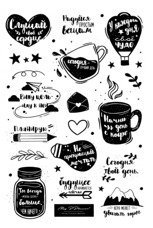 С помощью них вы сделаете планер самым красивым. Тут минималистичные надписи, спокойные и яркие рисунки - выбирайте в зависимости от настроения.