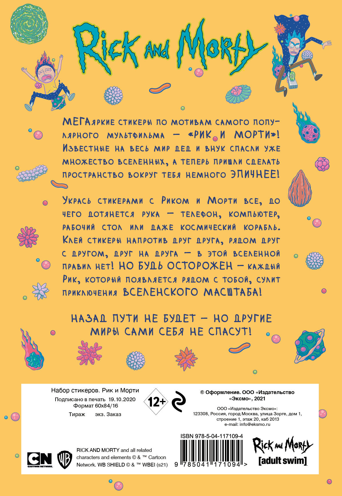 МЕГАяркие стикеры по мотивам самого популярного мультфильма с огромной фанатской аудиторией - «РИК И МОРТИ»! Известные на весь мир дед и внук спасли уже множество вселенных, а теперь пришли сделать пространство вокруг тебя немного ЭПИЧНЕЕ! В этом лицензионном наборе, от которого сносит башню, ты найдешь множество стикеров с любимыми героями в самых разных состояниях и локациях. Укрась стикерами с Риком и Морти все, до чего дотянется рука - телефон, компьютер, рабочий стол или даже космический корабль. Клей стикеры напротив друг друга, рядом друг с другом, друг на друге - в этой вселенной правил нет! НО БУДЬ ОСТОРОЖЕН - каждый Рик, который появляется рядом с тобой, сулит приключения ВСЕЛЕНСКОГО МАСШТАБА! Назад пути не будет - но другие миры сами себя не спасут!| Издательство | Эксмо |
