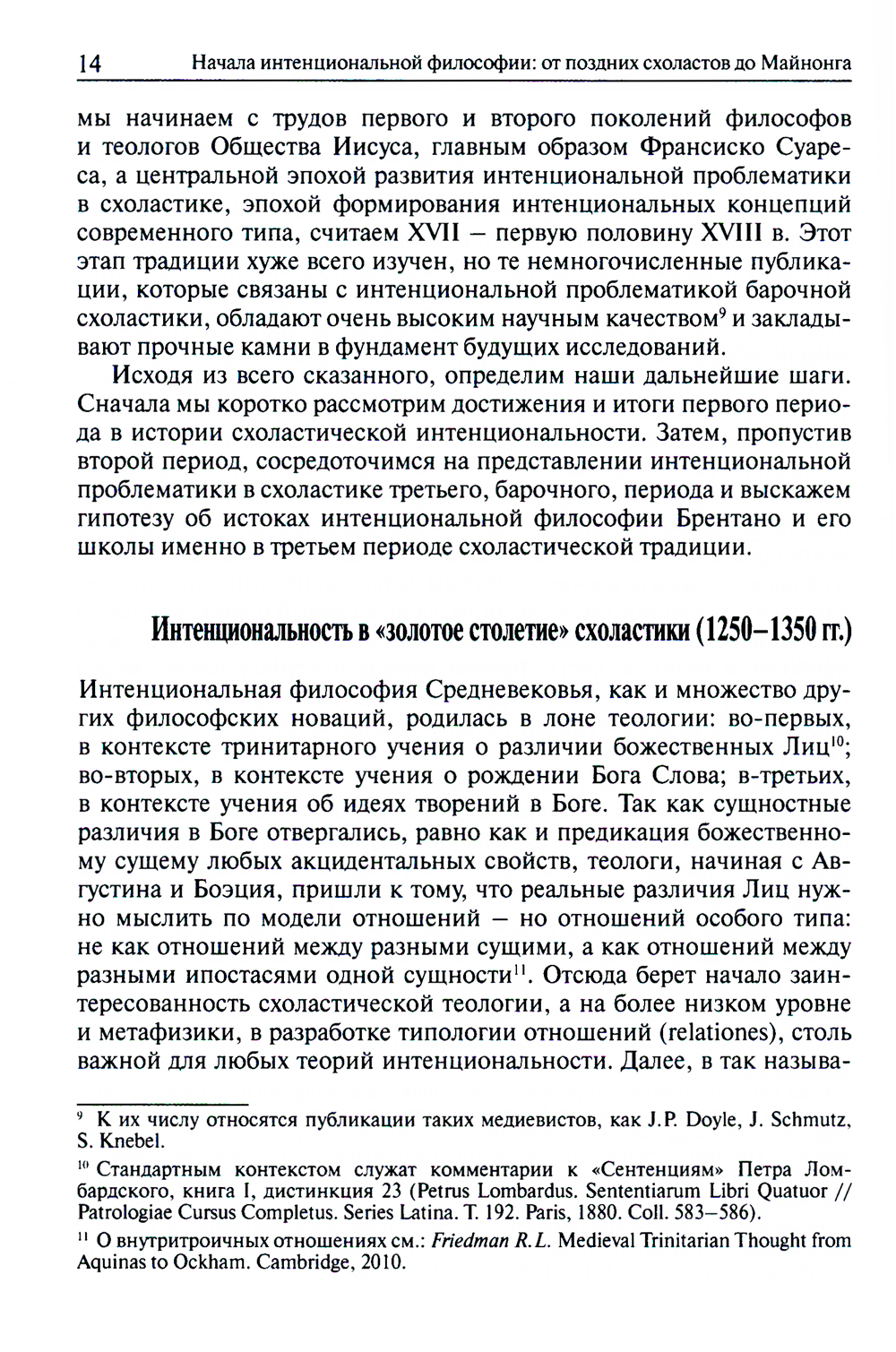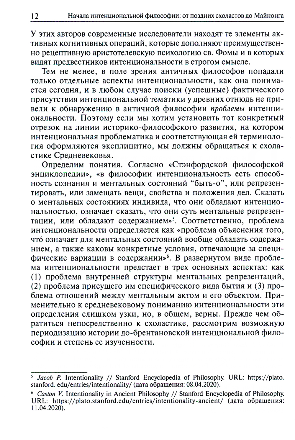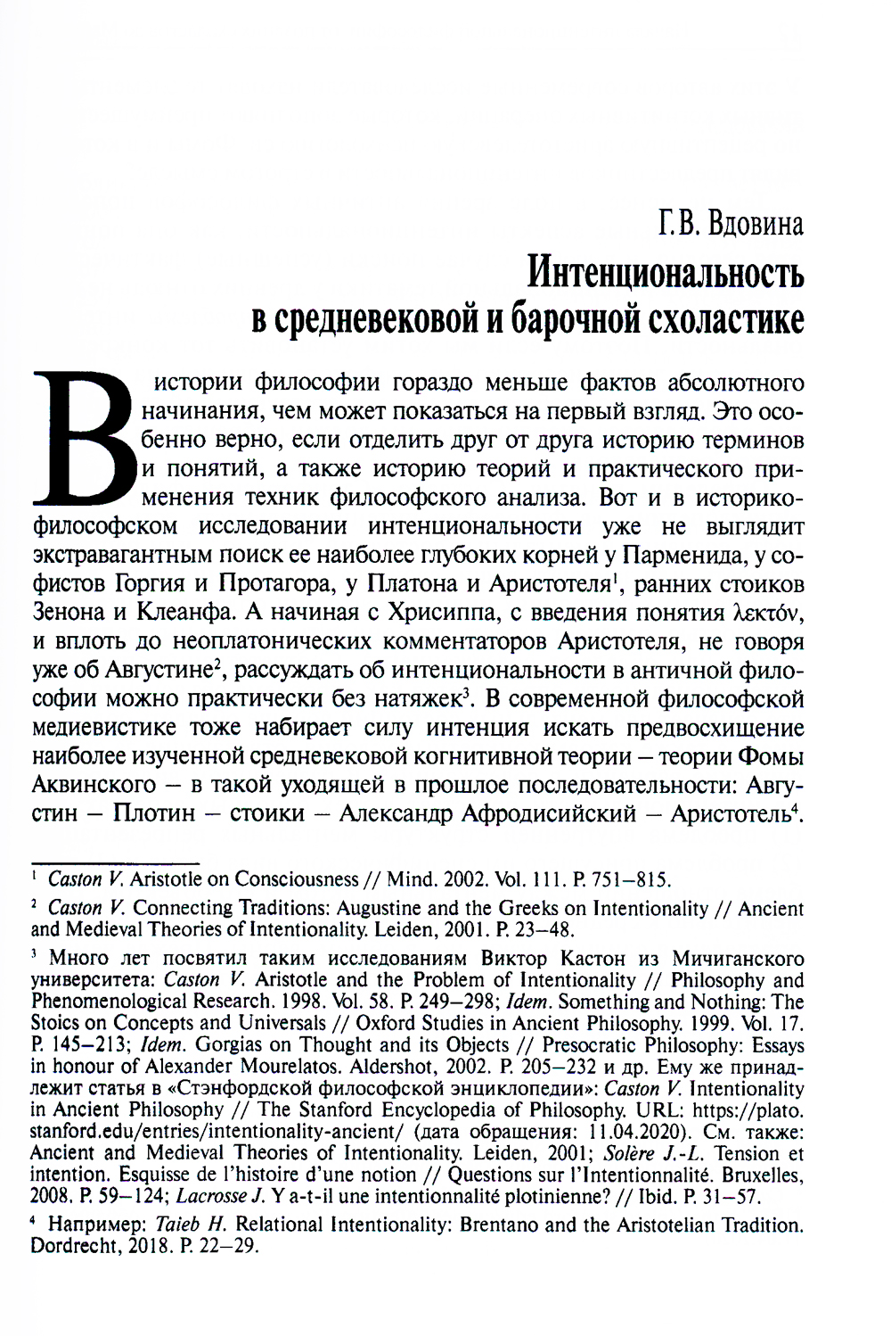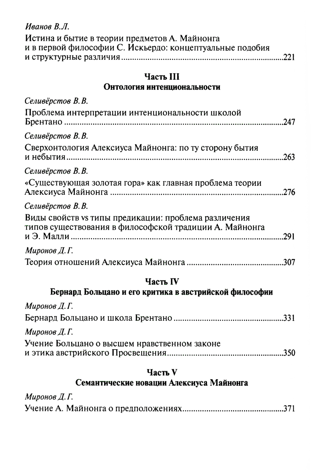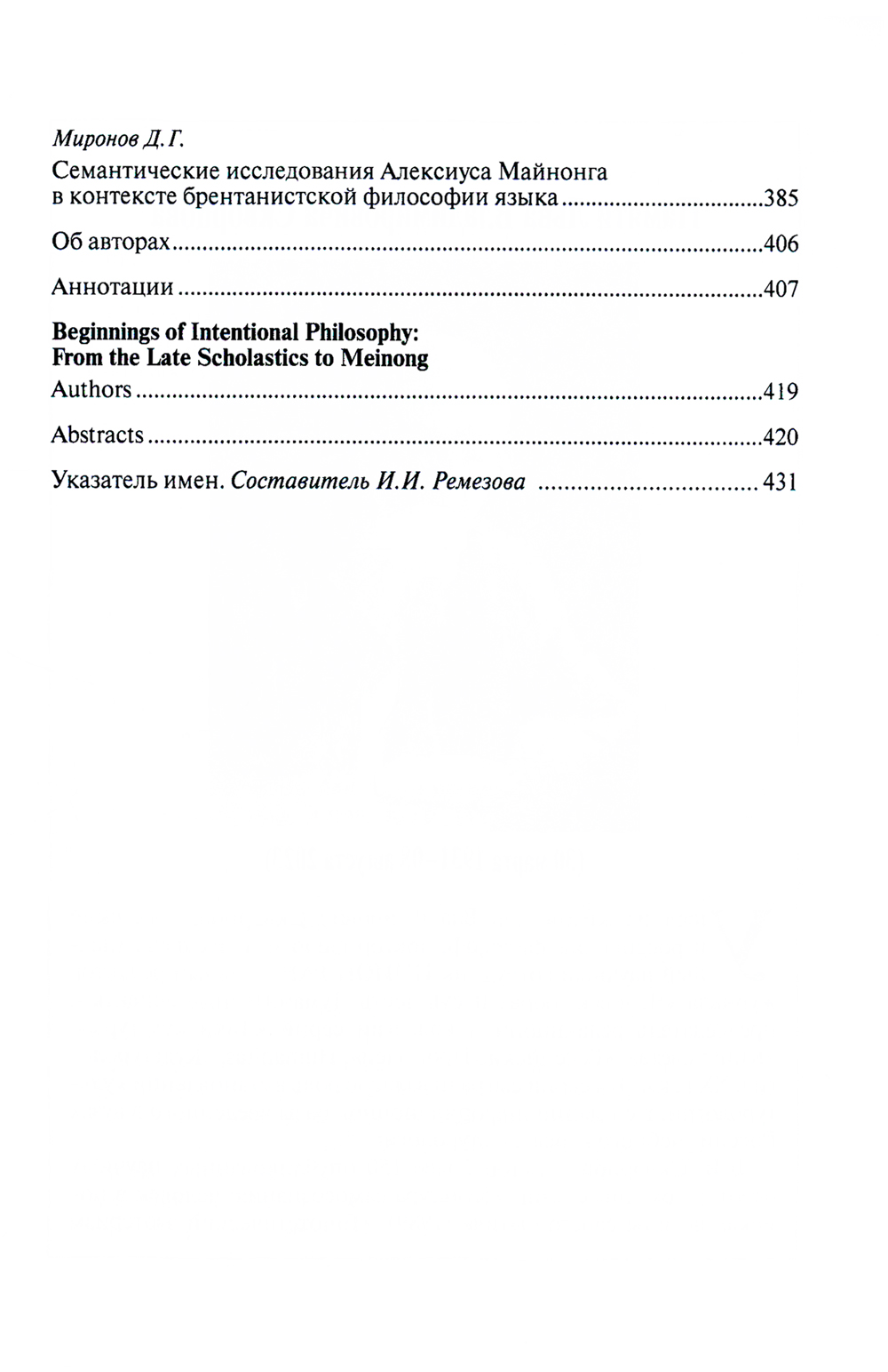 Коллективная монография "Начала интенциональной философии: от поздних схоластов до Майнонга" представляет собой аналитическое исследование истоков и некоторых важных аспектов философии Франца Брентано и его последователей, прежде всего Алексиуса Майнонга. В первой части книги (автор Г. В. Вдовина) прослеживаются вероятные связи между австрийской интенциональной философией и поздней схоластикой; часть вторая (В. Л. Иванов) посвящена центральным онтологическим проблемам философии иезуитов XVII в., с ее очевидными параллелями концепциям австрийских философов XIX - нач. XX вв. В третьей части (В. В. Селиверстов и Д. Г. Миронов) анализируются базовые понятия интенциональной философии школы Брентано. Часть четвертая (Д. Г. Миронов) рассматривает гипотезу о философии Б. Больцано как о возможном передаточном звене между поздней схоластикой и австрийской интенциональной мыслью, а также этические концепции Больцано. В пятой части (Д. Г. Миронов) исследуются семантические новации А. Майнонга.