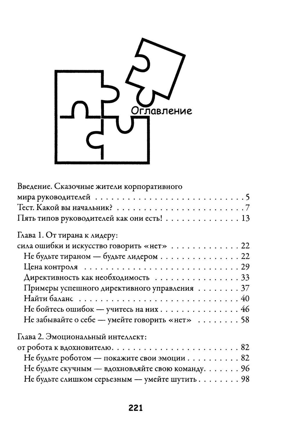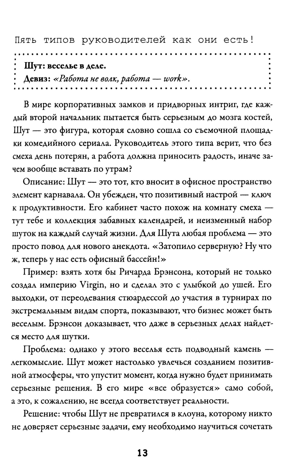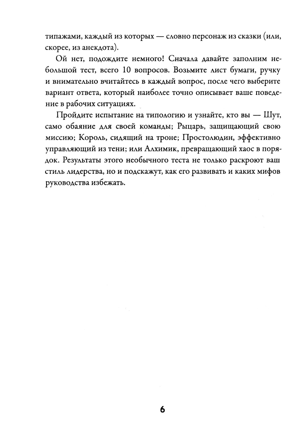 «Начальник, ты не прав!» - путеводитель в мир настоящего лидерства. Узнайте, как пять типов руководителей - Шут, Рыцарь, Король, Алхимик и Простолюдин - мешают или помогают вам управлять. Книга поможет вам превратиться из тирана в вдохновителя, вы научитесь делегировать, общаться с командой и находить баланс. А также вы будете не просто руководить, а вести за собой!