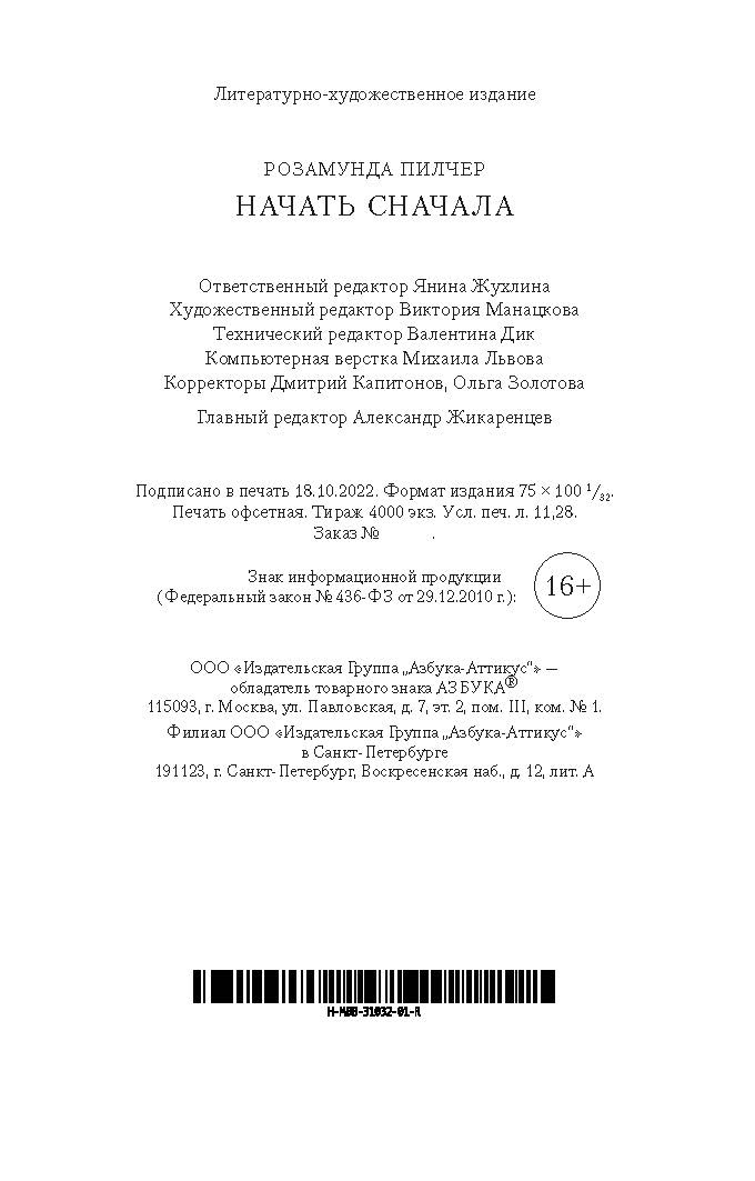 Книги Розамунды Пилчер (1924-2019) знают и любят во всем мире. Ее романы незамысловаты и неторопливы, зато в них много подлинного тепла и сердечности. Кредо писательницы можно охарактеризовать фразой: «У хороших людей всегда все будет хорошо» - и в данном случае это залог устойчивого читательского успеха. В романе «Начать сначала», как и во многих книгах Пилчер, основное действие разворачивается в прекрасном, суровом, ветреном Корнуолле. Эмма мечтает провести там несколько недель вместе с отцом, посвятившим себя искусству. Она, как никто другой, нуждается в близких людях, но ей многое придется пережить, чтобы понять важную вещь: иногда отпустить того, кого любишь, - это первый шаг к сохранению любви...| Издательство | Азбука |