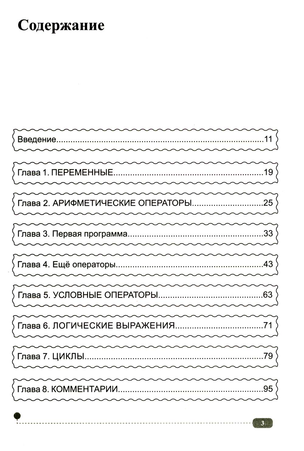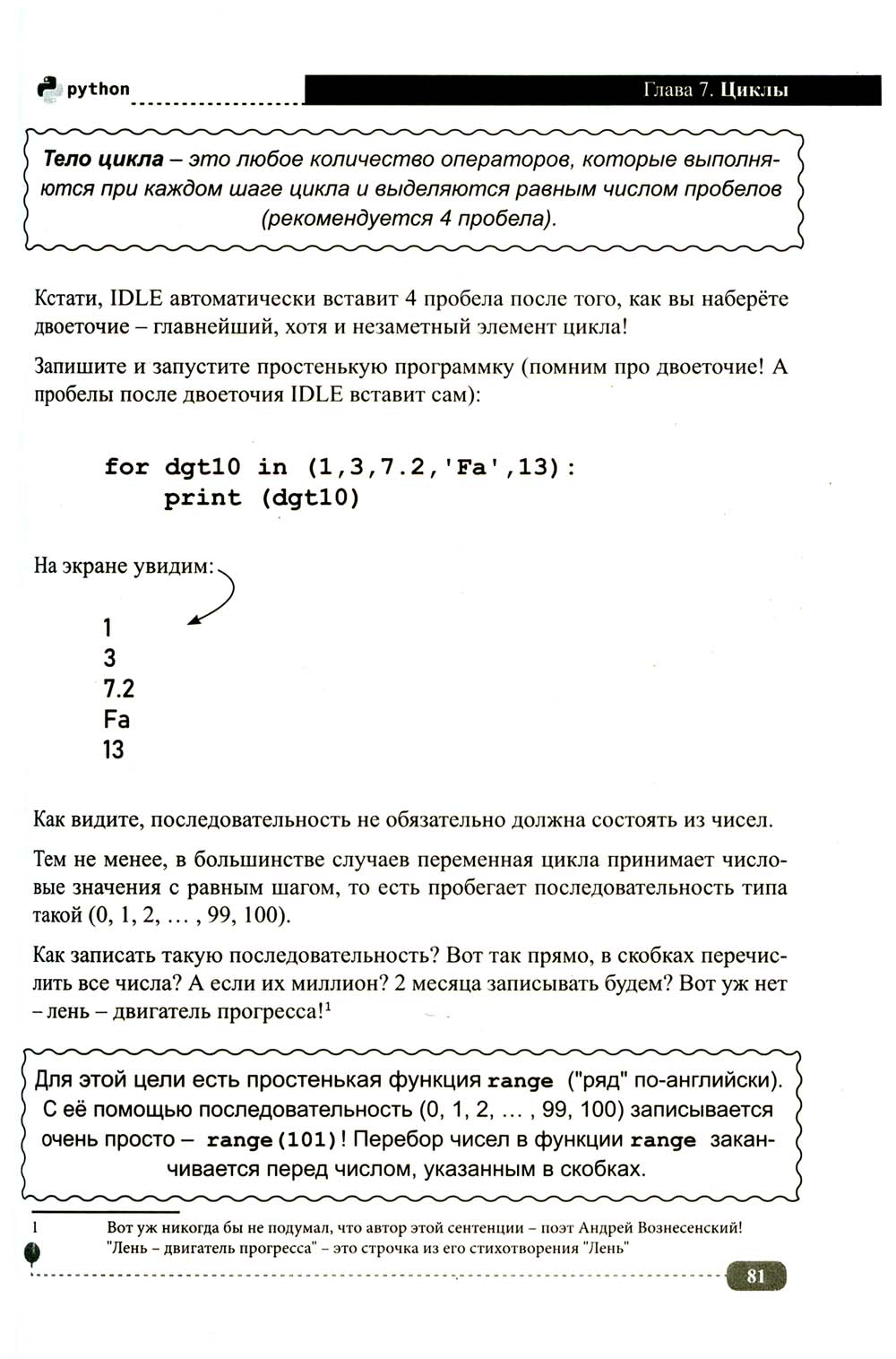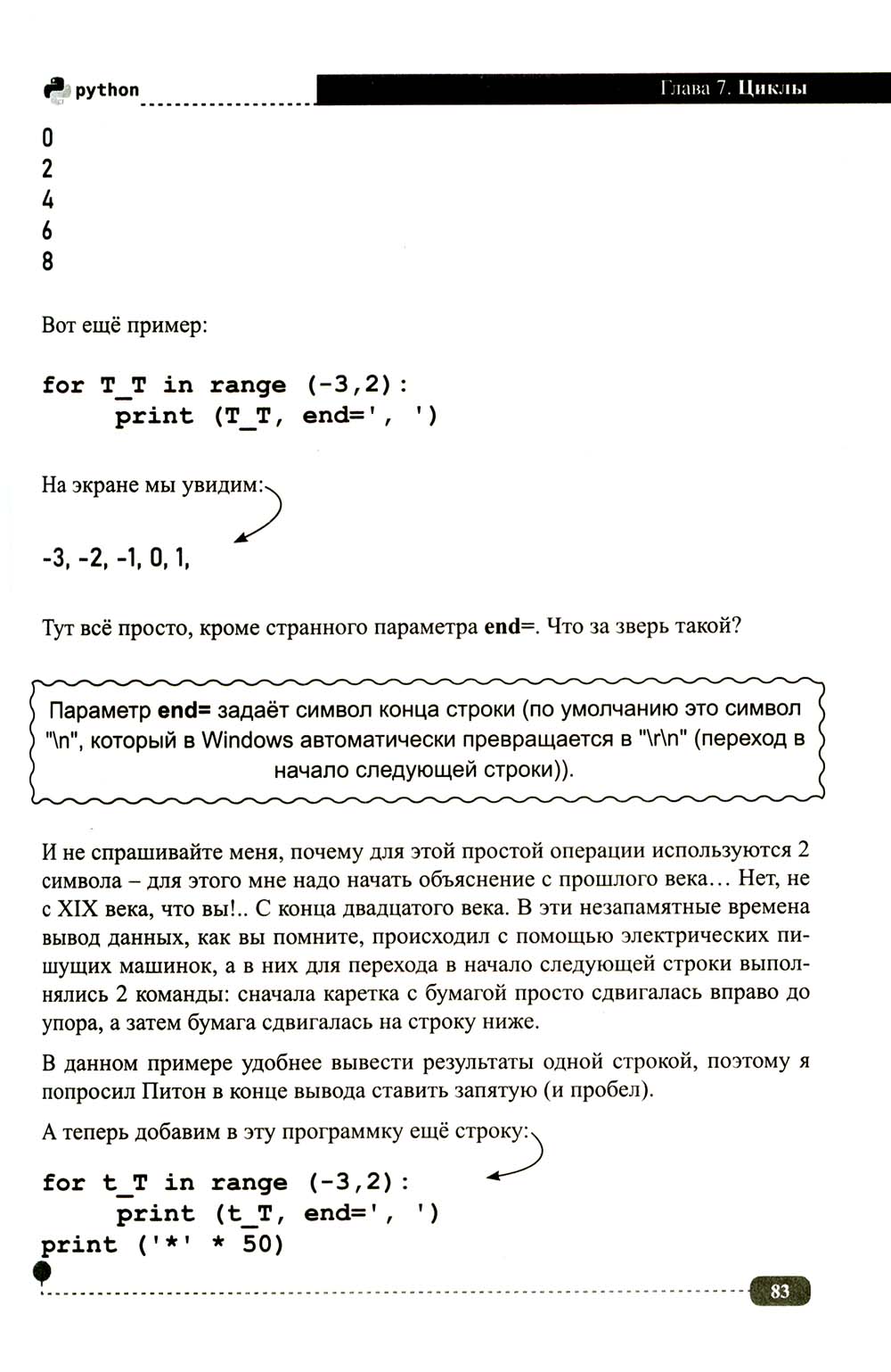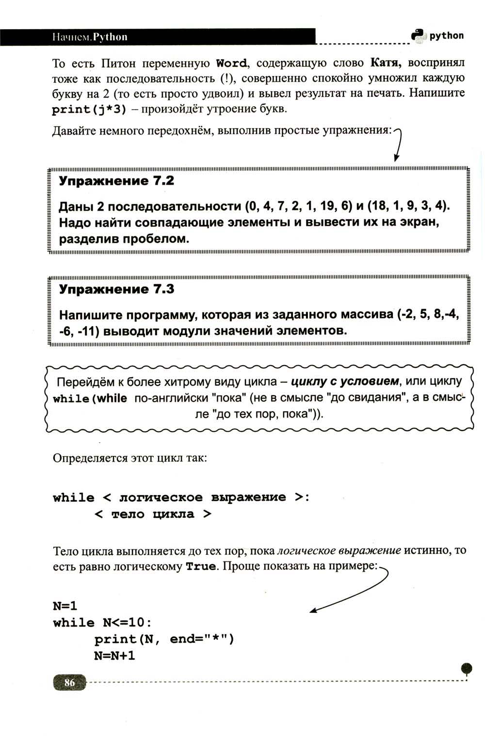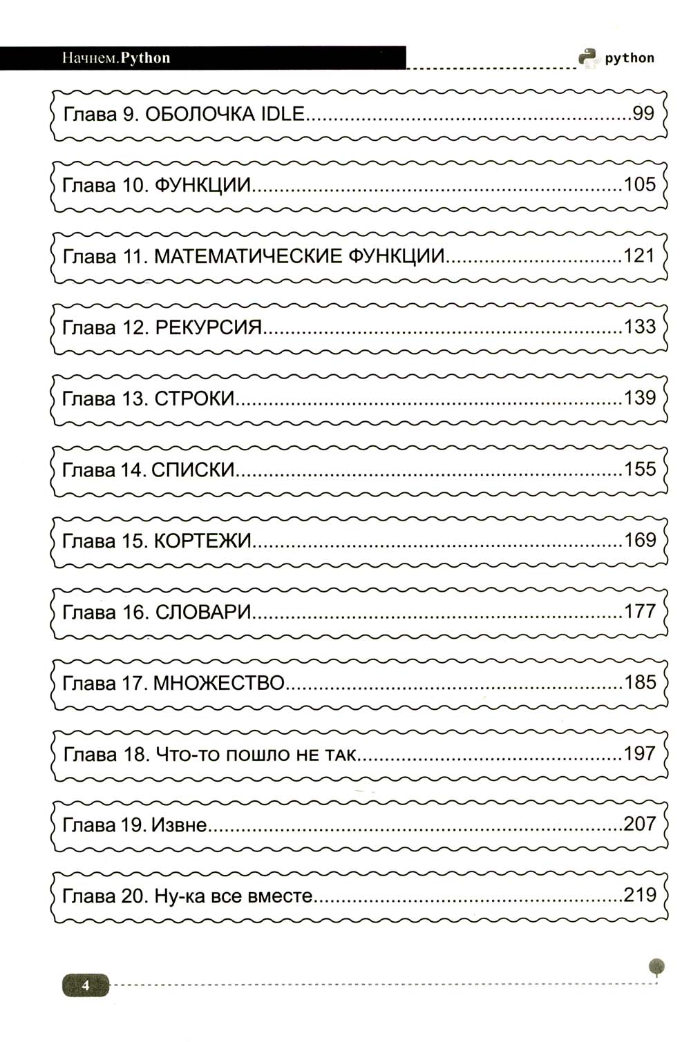 Данная книга поможет вам в изучении языка программирования Python. Многоцелевая направленность Python позволяет решать самые разные задачи: математические, физические, лингвистические, бухгалтерские, экономические, заниматься созданием игр(!), работой в Интернете и многое другое. Отличием книги является легкий, понятный и даже где-то юмористический подход автора к программированию на Python, благодаря чему вы будете учиться писать программы, ошибаться вместе с автором, исправлять ошибки и любоваться на готовые работоспособные программы... В книге рассмотрены все ключевые аспекты Python: переменные, операторы, логические выражения, циклы, комментарии, функции, рекурсия, строки, кортежи, словари и множества. В каждой главе теоретическую часть дополняют многочисленные практические примеры и задания для самостоятельного решения (впрочем, для самых нетерпеливых в конце книги приводятся правильные ответы). Книга предназначена для широкого круга читателей, не требует навыков в программировании и будет полезна всем, кто хочет познакомиться с Python.