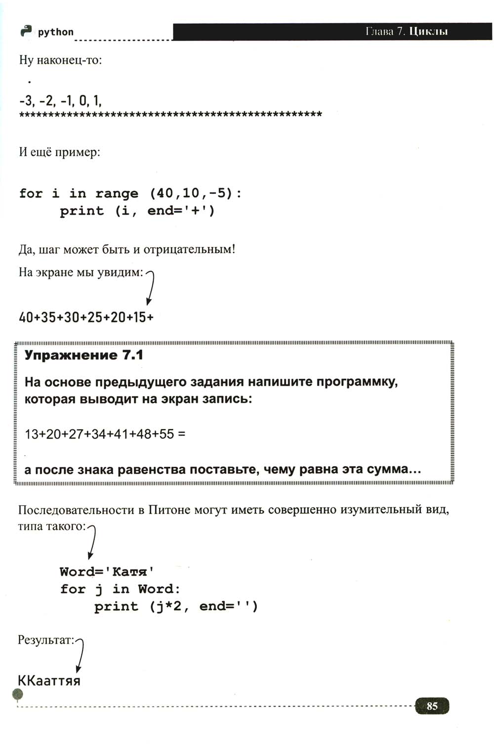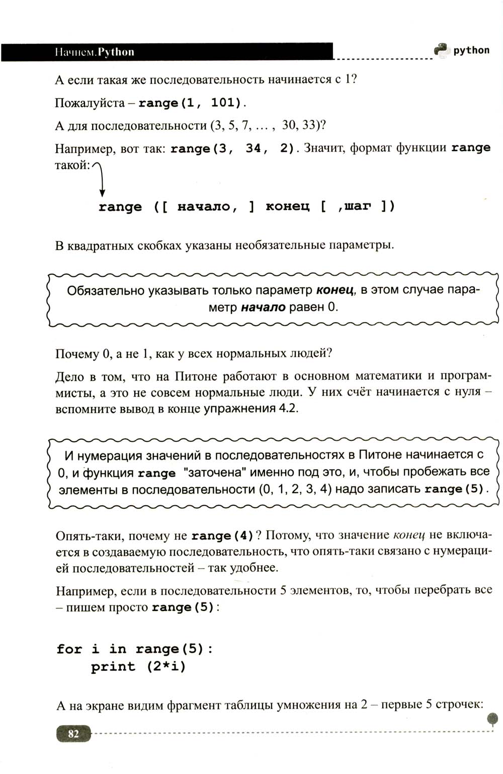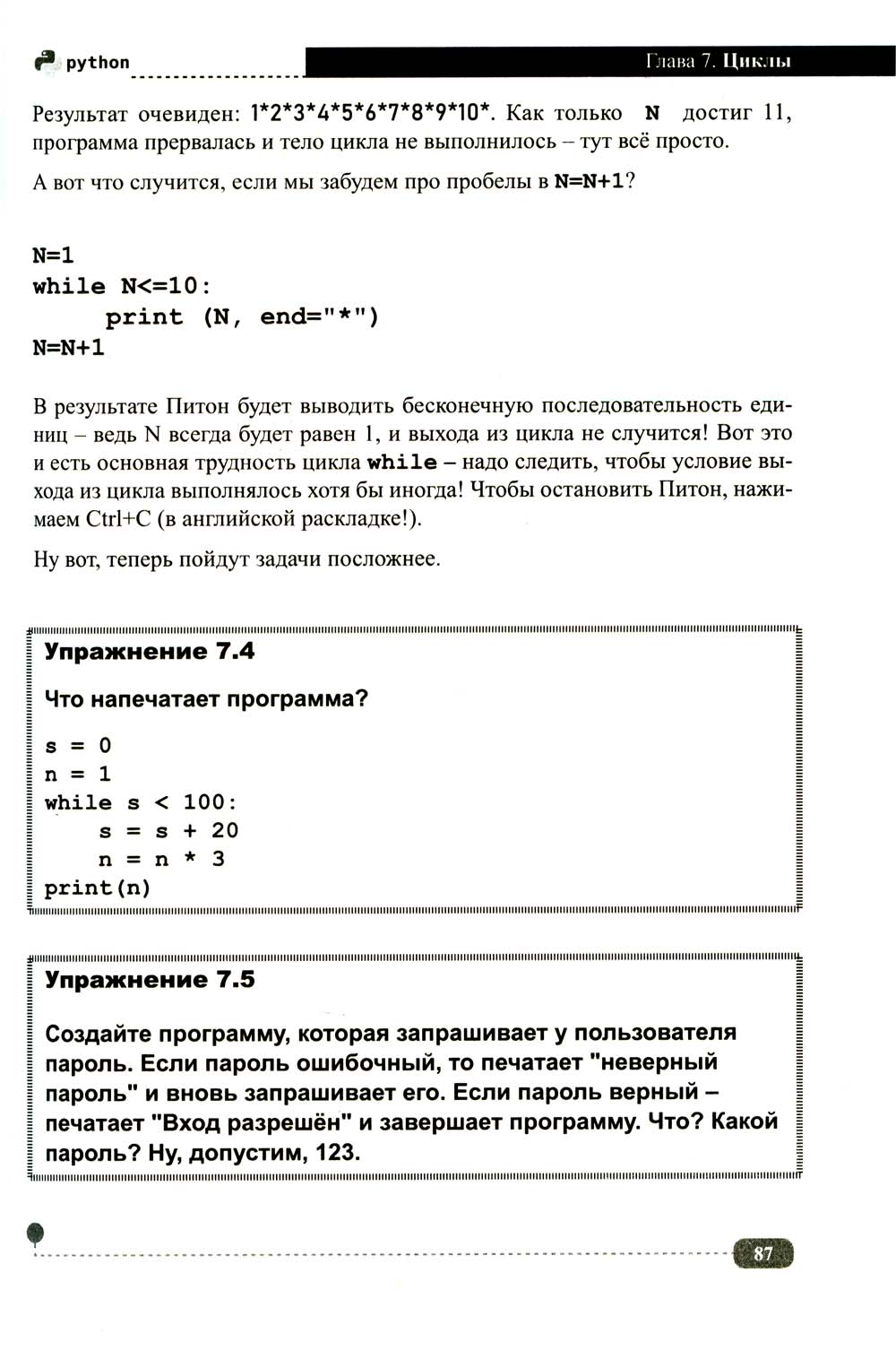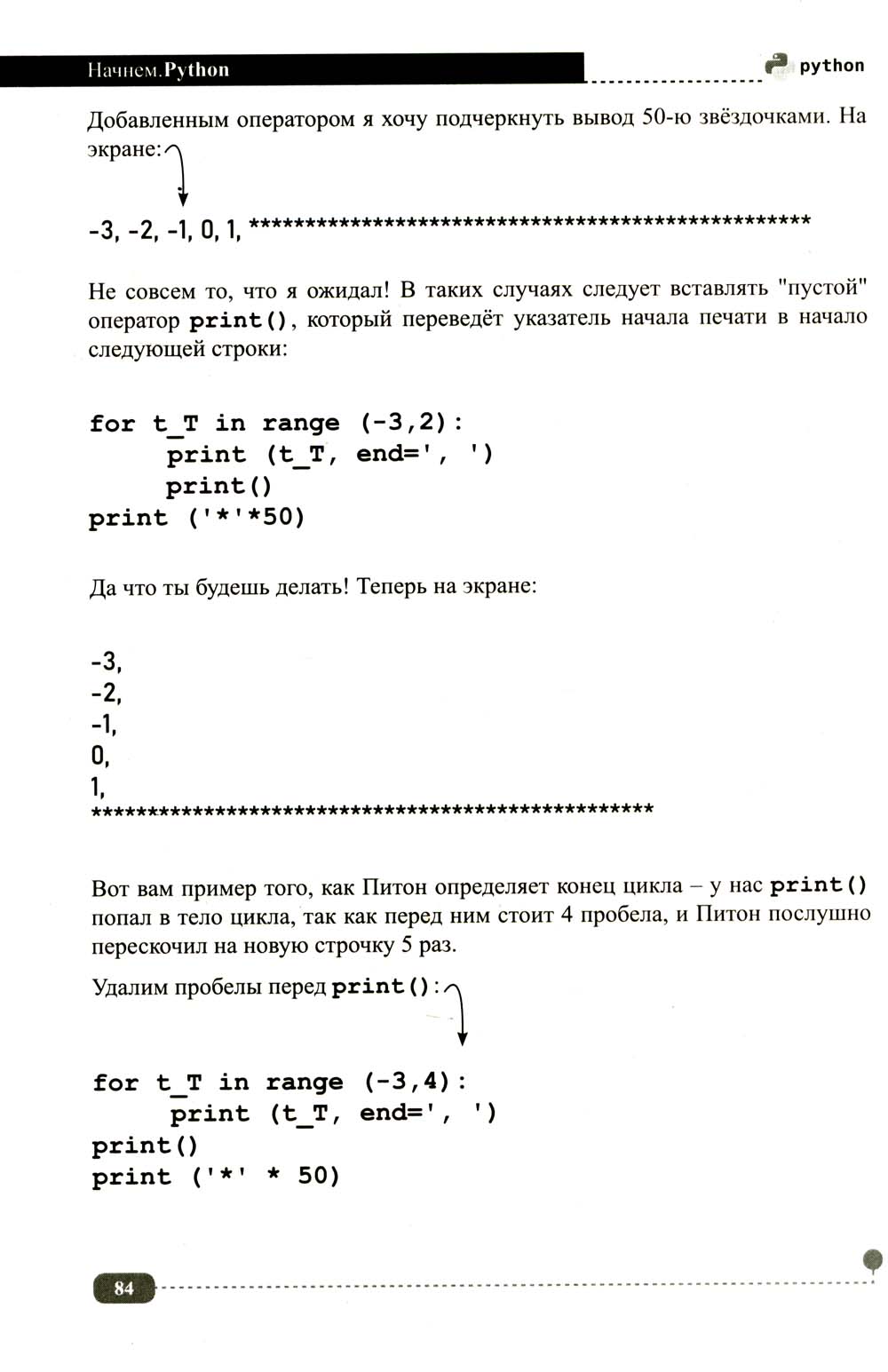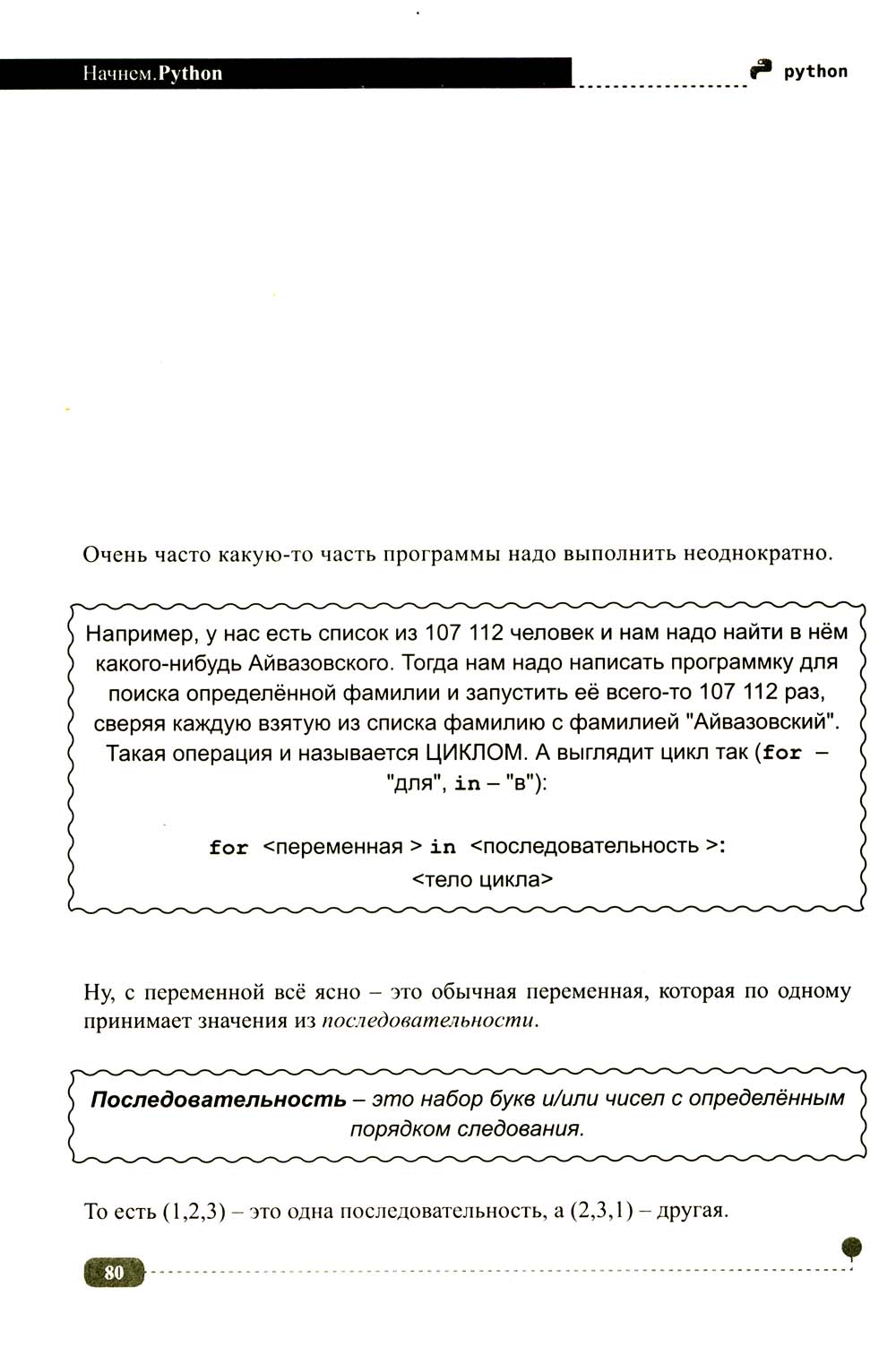 Данная книга поможет вам в изучении языка программирования Python. Многоцелевая направленность Python позволяет решать самые разные задачи: математические, физические, лингвистические, бухгалтерские, экономические, заниматься созданием игр(!), работой в Интернете и многое другое. Отличием книги является легкий, понятный и даже где-то юмористический подход автора к программированию на Python, благодаря чему вы будете учиться писать программы, ошибаться вместе с автором, исправлять ошибки и любоваться на готовые работоспособные программы... В книге рассмотрены все ключевые аспекты Python: переменные, операторы, логические выражения, циклы, комментарии, функции, рекурсия, строки, кортежи, словари и множества. В каждой главе теоретическую часть дополняют многочисленные практические примеры и задания для самостоятельного решения (впрочем, для самых нетерпеливых в конце книги приводятся правильные ответы). Книга предназначена для широкого круга читателей, не требует навыков в программировании и будет полезна всем, кто хочет познакомиться с Python.