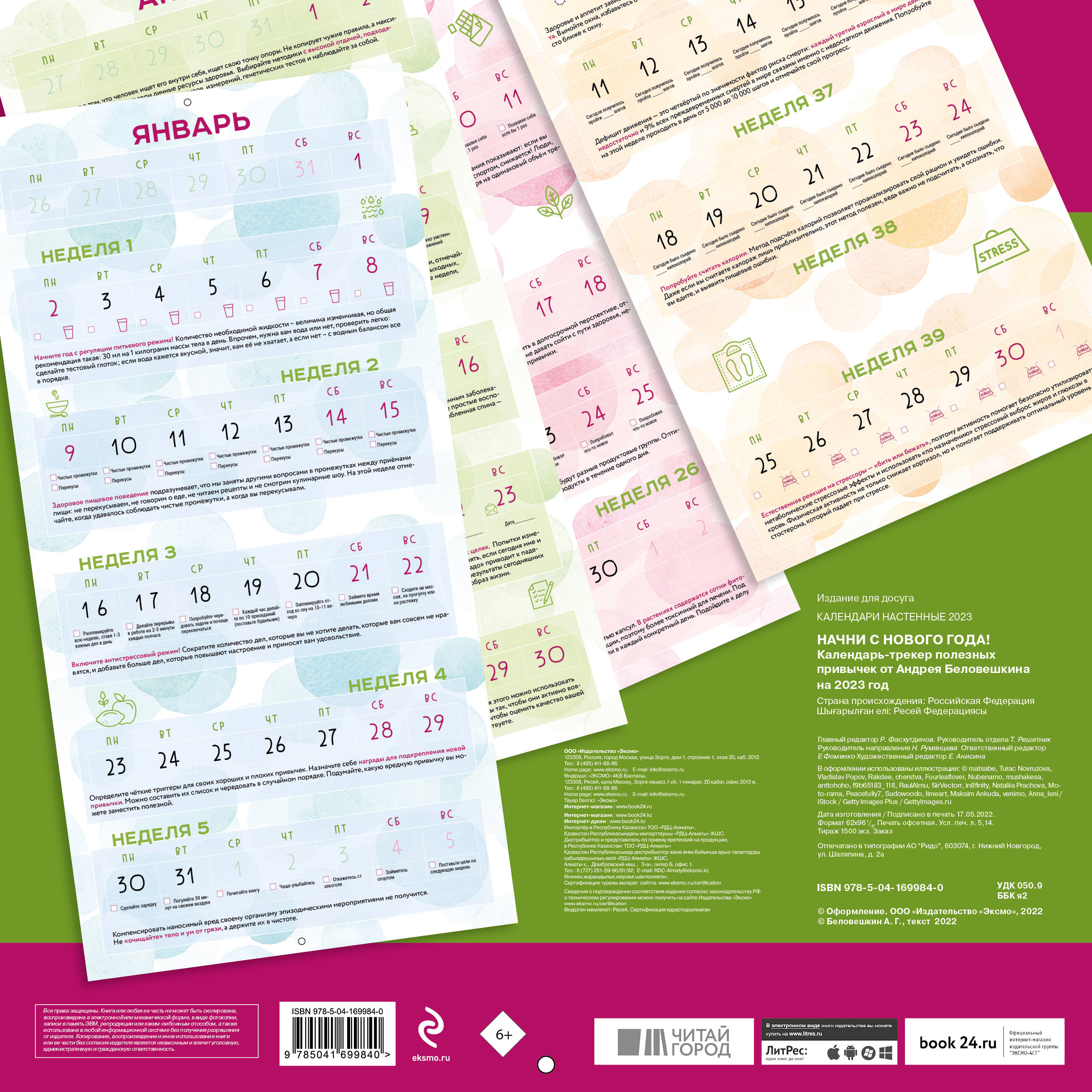 Практичный и эстетичный, этот календарь каждый месяц будет радовать вас. Необязательно кардинально менять свою жизнь. Достаточно регулярно делать небольшие шаги в нужном направлении, и вы сами не заметите, как приобретете полезные привычки. В этом вам поможет календарь-трекер от врача и автора бестселлеров Андрея Беловешкина. Внутри вас ждут полезные советы на каждую неделю, следуя которым вы сможете укрепить здоровье и поднять настроение. Свой успех можно отмечать маркером прямо в календаре. Для кого: Для всех поклонников творчества Андрея Беловешкина. Технические параметры: Тип календаря - настенный перекидной. Год - 2023. Календарная сетка - с разбивкой по месяцам. Вид скрепления - скрепка. Ширина - 30 см. Высота - 30 см. Внутренний блок - мелованная бумага 150 г/м2. Подложка - плотный гофрокартон для поддержания формы. Индивидуальная упаковка в плотный целлофановый пакет. О серии: Наши настенные календари отличаются высоким качеством исполнения! Иллюстрации, напечатанные на глянцевой бумаге высочайшего качества, станут настоящим украшением дома, а в календарной сетке найдется место для ваших планов: большие клетки позволят делать записи и организовать свой год! В календаре также отмечены все государственные праздники. В серии настенных календарей издательства «ЭКСМО» каждый найдет тему по вкусу: подборки с самыми знаменитыми произведениями искусства и видами, легендарные кинематографические саги и игры, главные книжные авторы и бестселлеры, фотографии и иллюстрации любимых животных и многое-многое другое!