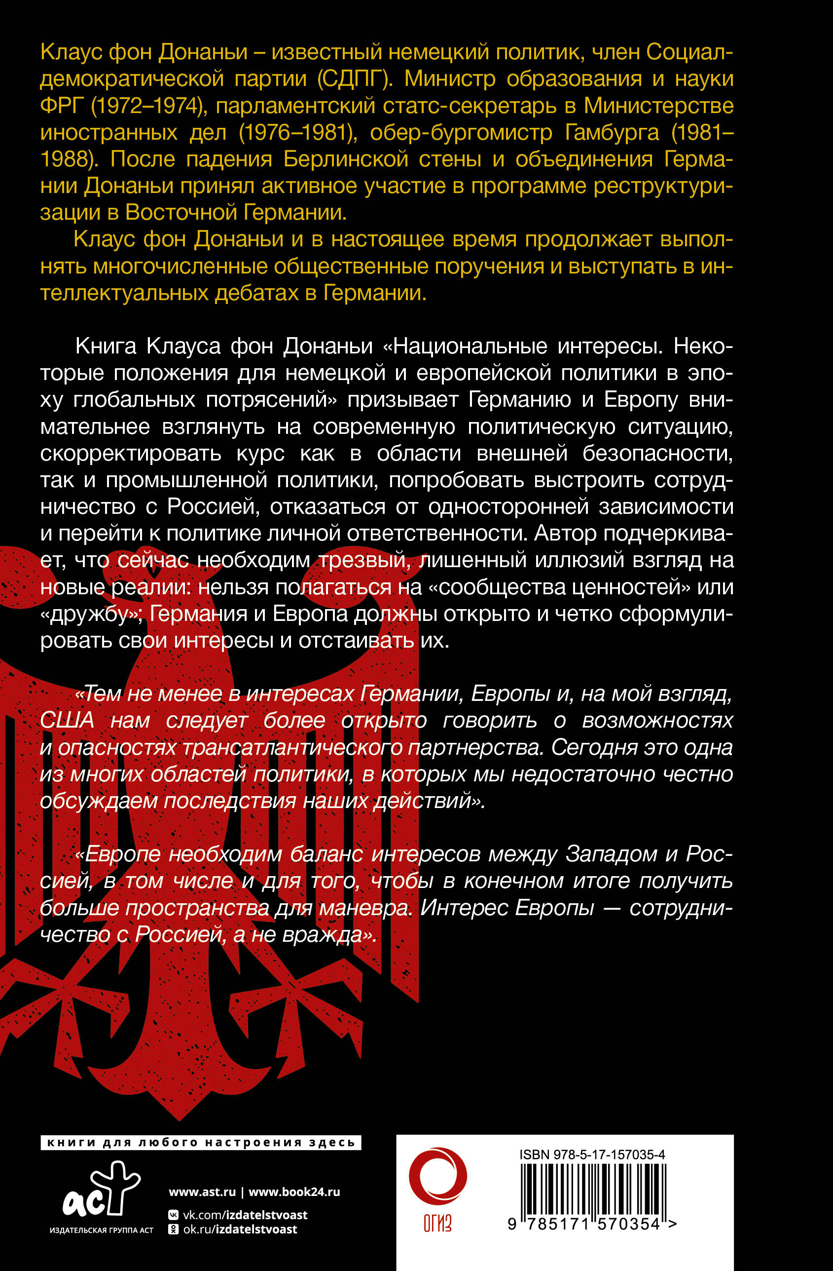 Клаус фон Донаньи - известный немецкий политик, член Социал-демократической партии (СДПГ). Министр образования и науки ФРГ (1972-1974), парламентский статс-секретарь в Министерстве иностранных дел (1976-1981), обер-бургомистр Гамбурга (1981-1988). После падения Берлинской стены и объединения Германии Донаньи принял активное участие в программе реструктуризации в Восточной Германии. Клаус фон Донаньи и в настоящее время продолжает выполнять многочисленные общественные поручения и выступать в интеллектуальных дебатах в Германии. Книга Клауса фон Донаньи "Национальные интересы. Некоторые положения для немецкой и европейской политики в эпоху глобальных потрясений" призывает Германию и Европу внимательнее взглянуть на современную политическую ситуацию, скорректировать курс как в области внешней безопасности, так и промышленной политики, попробовать выстроить сотрудничество с Россией, отказаться от односторонней зависимости и перейти к политике личной ответственности. Автор подчеркивает, что сейчас необходим трезвый, лишенный иллюзий взгляд на новые реалии: нельзя полагаться на "сообщества ценностей" или "дружбу"; Германия и Европа должны открыто и четко сформулировать свои интересы и отстаивать их.| Издательство | Издательство "АСТ" |