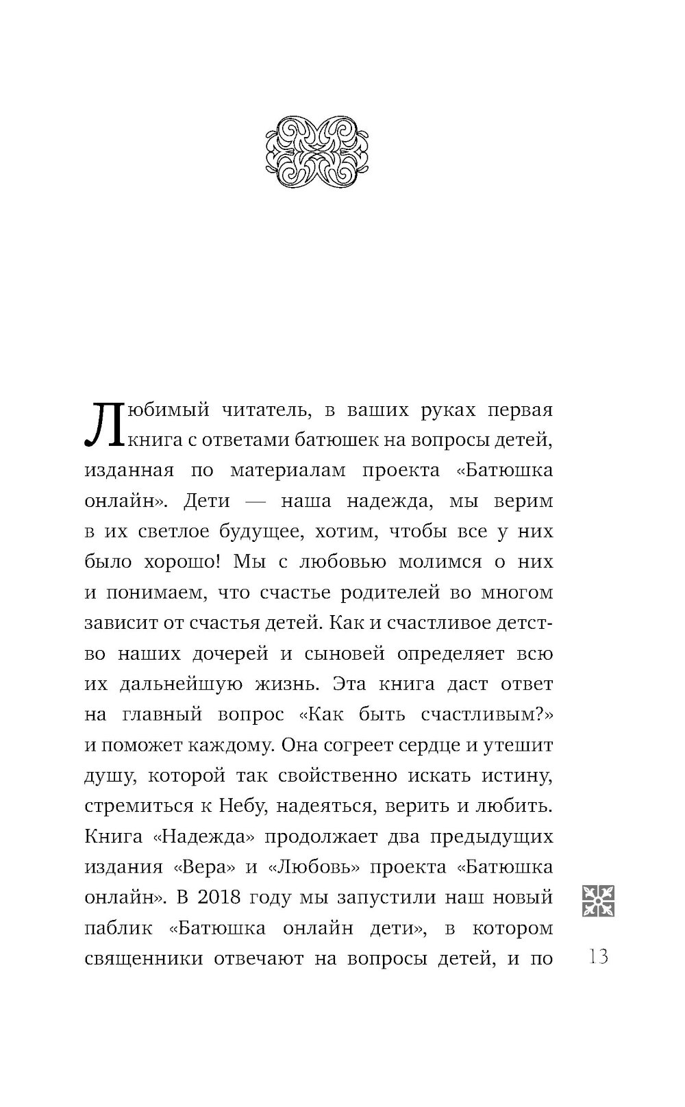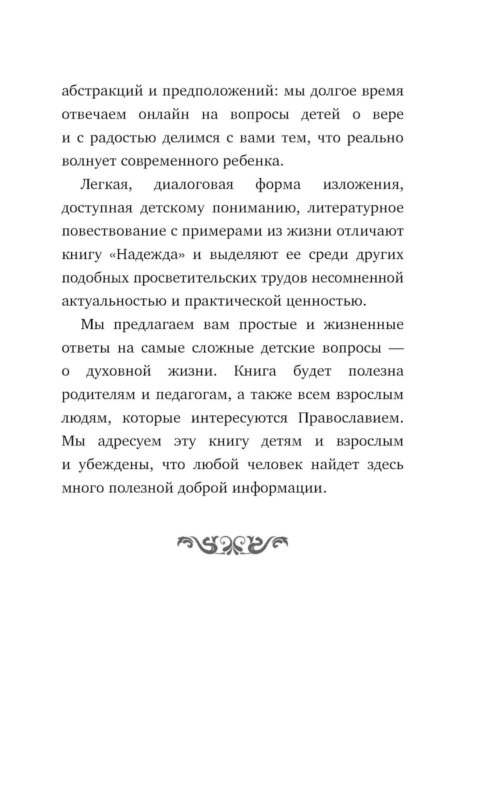 В рамках проекта «Батюшка онлайн» известные православные священники отвечают на самые разные, часто совсем не детские, вопросы детей. Это уникальный коллективный труд богословов, педагогов и психологов. Легкая, диалоговая форма изложения, доступная детскому пониманию, литературное повествование с примерами из жизни отличают книгу «Надежда» и выделяют ее среди других изданий. Книга будет полезна родителям и педагогам, а также всем взрослым людям, верующим и тем, кто интересуются православием. Рекомендовано к публикации Издательским советом Русской Православной Церкви. Номер Издательского совета - ИС Р24-408-0195.| Издательство | Эксмо |