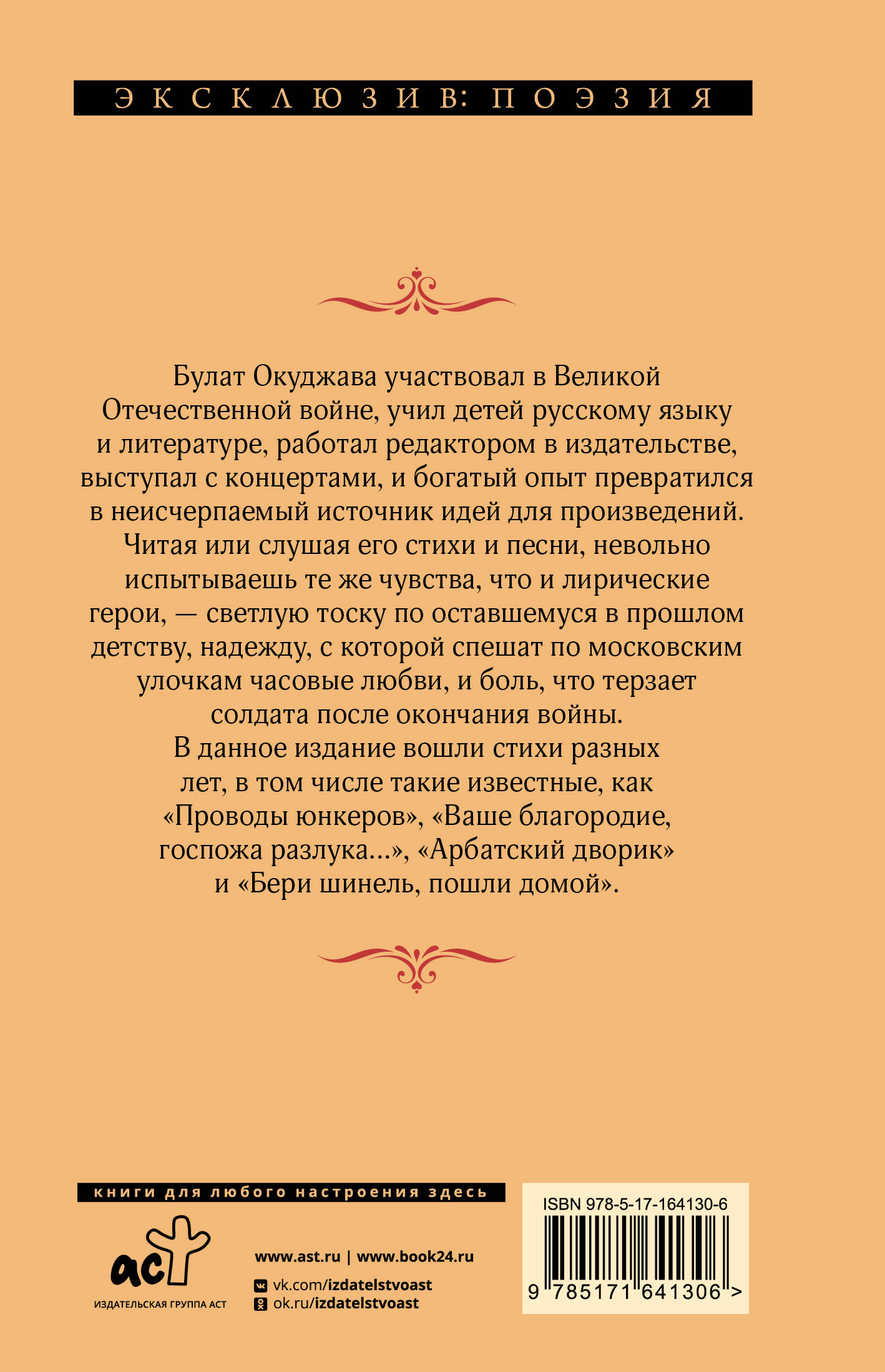 Лучшие стихи Булата Окуджавы под одной обложкой. В данное издание вошли стихи разных лет, в том числе такие известные, как «Песенка о юнкерах», «Ваше благородие, госпожа разлука…», «Арбатский дворик» и «Бери шинель, пошли домой».| Издательство | Издательство "АСТ" |