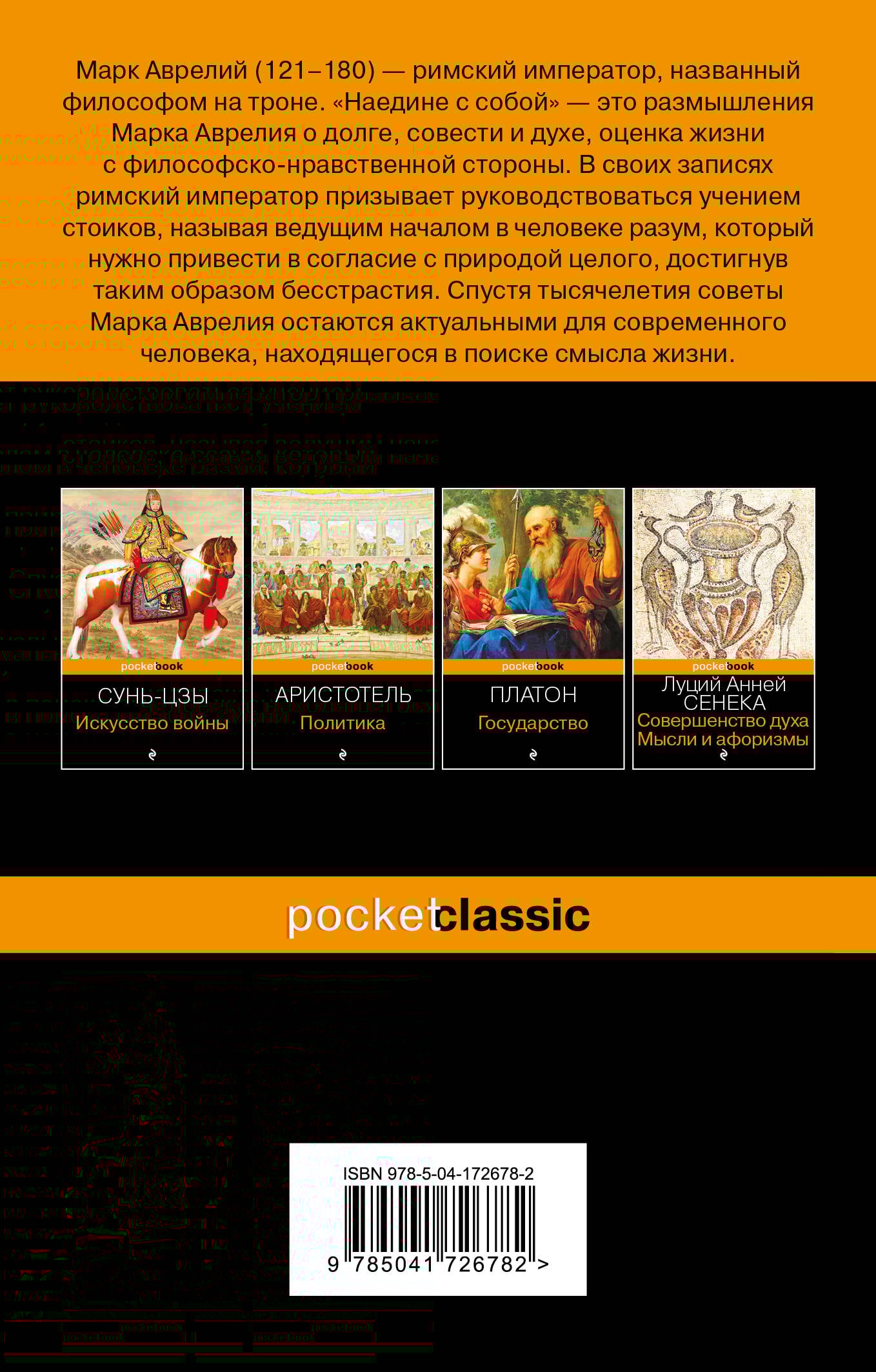 Марк Аврелий (121-180) - римский император «Золотого века», справедливо названный «философом на троне». Он пользовался несомненным успехом в позднеантичное время, а в XVI веке возродился в европейских философских кругах. «Наедине с собой» - это размышления римского императора Марка Аврелия о долге, совести и духе, оценка жизни с философско-нравственной стороны. В своих записях римский император призывает руководствоваться учением стоиков, но и развивать его дальше, назвав ведущим началом в человеке не душу, но разум, который нужно привести в согласие с природой целого, достигнув таким образом бесстрастия. Спустя тысячелетия советы Марка Аврелия остаются актуальными для современного человека, постоянно находящегося в поиске смысла жизни.| Издательство | ООО "Издательство "Эксмо" |
