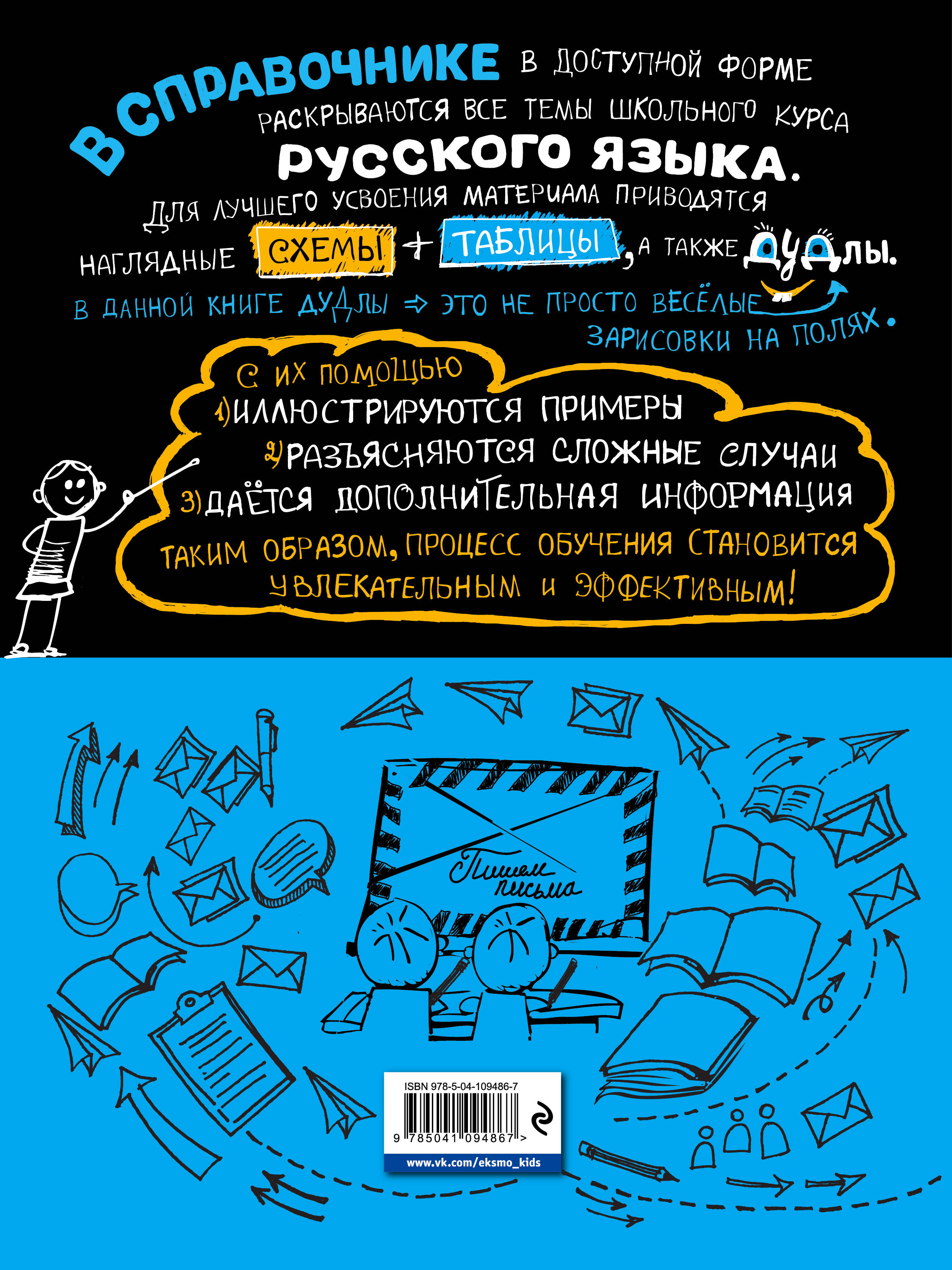 Справочник содержит сведения по всем темам школьного курса русского языка. Весь теоретический материал систематизирован, сопровождается примерами, наглядными схемами и таблицами, а также рисунками на полях (дудлами), которые помогают лучше запомнить полученную информацию. Пособие предназначено для школьников и учителей, а также для всех, кто интересуется вопросами русского языка. Справочник станет незаменимым помощником на протяжении всего школьного курса русского языка с 5 по 11 класс. Написанная доступным языком теория, наглядные примеры, схемы и таблицы помогут систематизировать и закрепить знания, а дудлы - забавные каракули - сделают даже самый сложный материал простым и понятным, превратив учёбу в увлекательный процесс. В книге также предусмотрено место для собственных примеров, примечаний и, конечно же, дудлов! Никогда ещё русский язык не был таким наглядным! • Все темы школьного курса. • Доступная подача материала. • Практические примеры. • Наглядные схемы и таблицы. • Забавные дудлы.| Издательство | ООО "Издательство "Эксмо" |