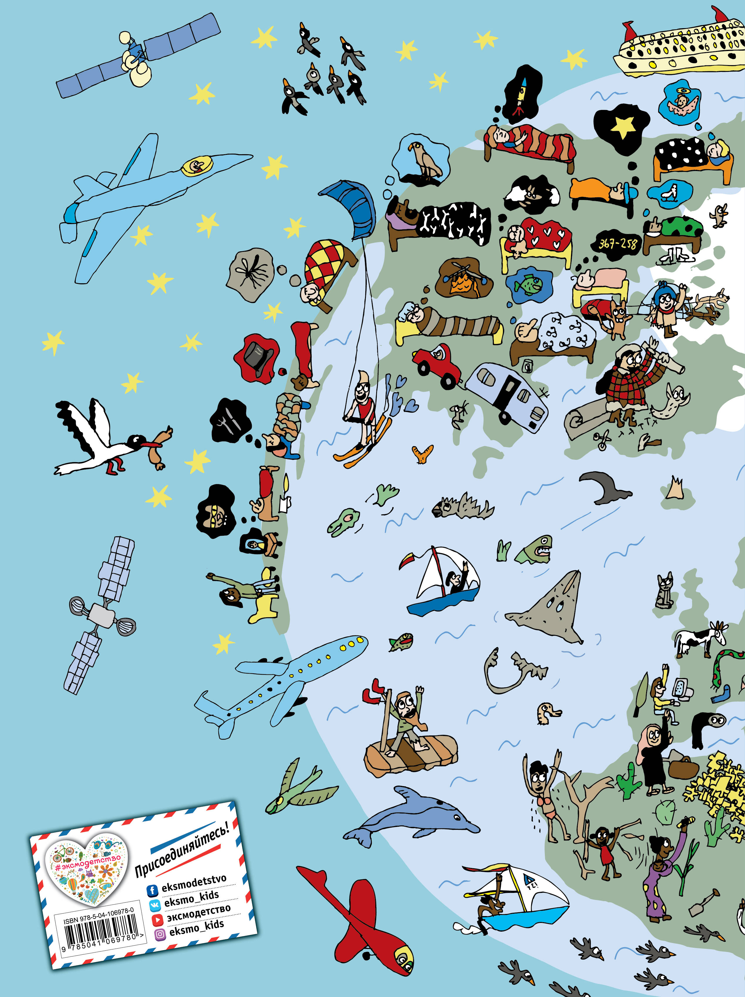В весёлой книге-виммельбухе, придуманной и нарисованной норвежской художницей Анной Фиске, мы познакомимся с очень разными жителями Земли. Жизнь на нашей планете не замирает ни на минуту, ведь когда в одном месте рождается день, в другом заходит солнце. Путешественник Том плывет на плоту через Атлантический океан, жители Африки выращивают загадочное дерево, письмо в бутылке совершает «кругосветное путешествие». В этой книге-игре, книге-парадоксе мало слов, но не каждая толстая книжка вместит столько историй, как эта!| Издательство | ООО "Издательство "Эксмо" |