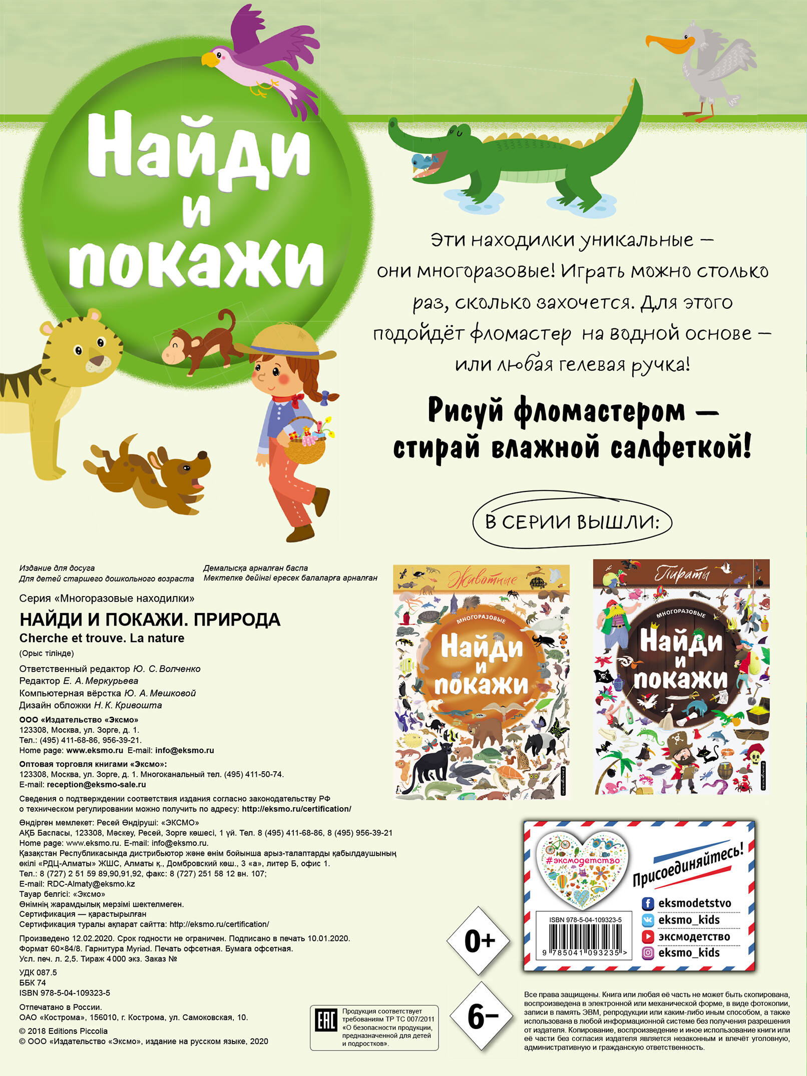Эти находилки уникальные - они многоразовые! Играть можно столько раз, сколько захочется. Для этого подойдёт фломастер - или любая гелевая ручка! Можно играть самому, можно в компании друзей, а можно с родителями. Рассматривайте красочные картинки и сочиняйте собственные истории!| Издательство | ООО "Издательство "Эксмо" |