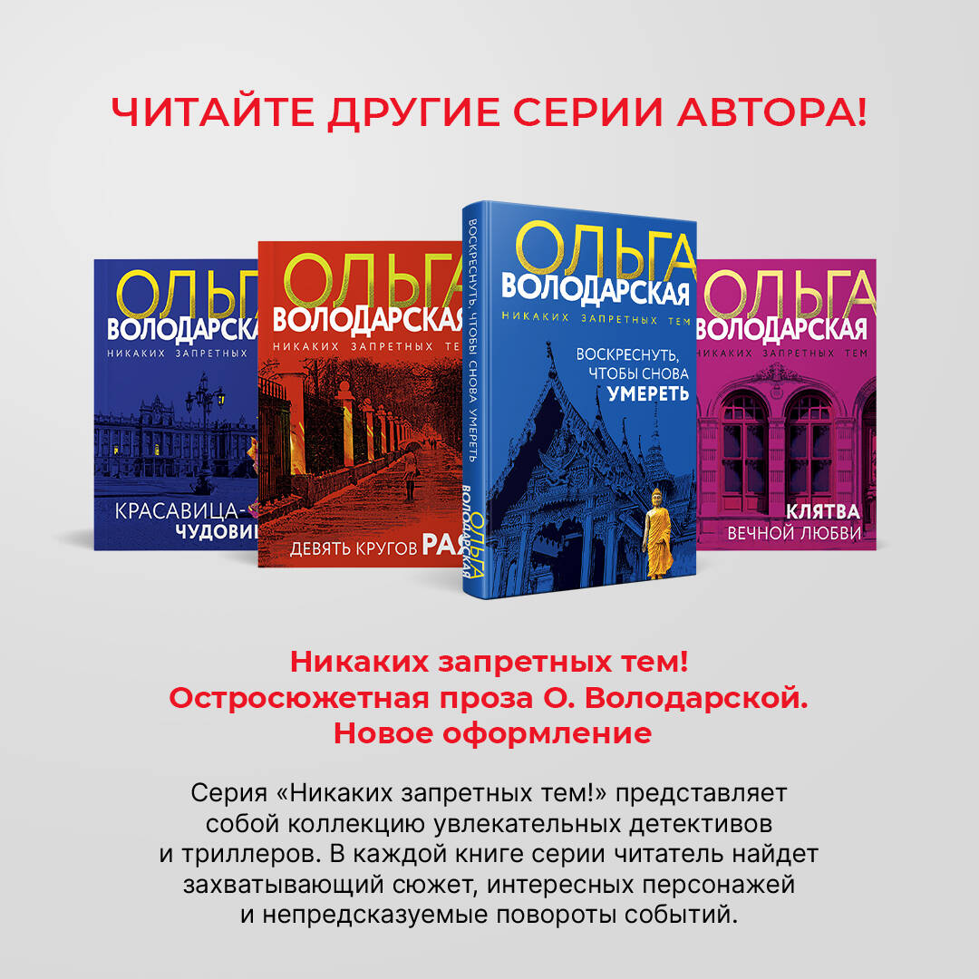 Она не знала, от кого бежит... Однажды почувствовав за собой слежку, Таня Мазаева не смогла отделаться от страха и не догадывалась, чье пристальное внимание привлекла. Она не сногсшибательна, не богата, не родовита, в ее прошлом нет тайн... Кроме одной. Два года назад, когда они дружной семьей отдыхали на Шри-Ланке, пропала без вести дочь. Ее искали, но как говорили местные, девочку забрал океан. Муж и сын поверили в это и смирились, а Таня упрямо повторяла: «Моя девочка жива!» Она не знала, как себя защитить от таинственного незнакомца, и решила бежать куда глаза глядят. Купив билет на первый вылетающий из страны самолет, попала в Турцию. Там выдохнула, расслабилась... И неожиданно для себя влюбилась! Новые отношения так поглотили Таню, что она забыла о своем преследователе. Как оказалось, зря... Остросюжетные романы Ольги Володарской уникальны - только в них наряду с захватывающей детективной интригой читатель найдет отражение самых спорных и запретных тем современной жизни. Ольга Володарская не боится правды и пишет так ярко, что ее книги читаются на одном дыхании!