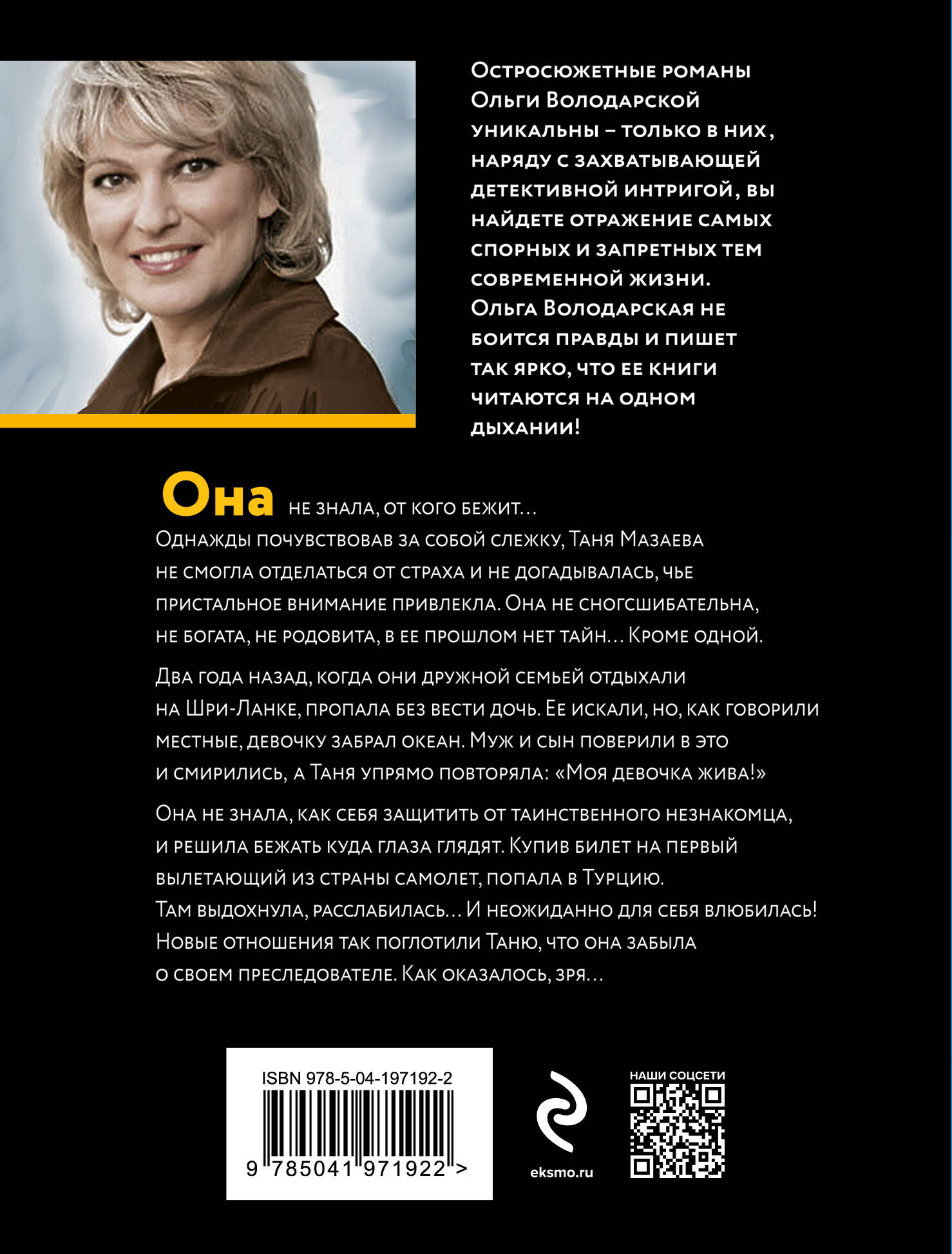 Она не знала, от кого бежит... Однажды почувствовав за собой слежку, Таня Мазаева не смогла отделаться от страха и не догадывалась, чье пристальное внимание привлекла. Она не сногсшибательна, не богата, не родовита, в ее прошлом нет тайн... Кроме одной. Два года назад, когда они дружной семьей отдыхали на Шри-Ланке, пропала без вести дочь. Ее искали, но, как говорили местные, девочку забрал океан. Муж и сын поверили в это и смирились, а Таня упрямо повторяла: «Моя девочка жива!» Она не знала, как себя защитить от таинственного незнакомца, и решила бежать куда глаза глядят. Купив билет на первый вылетающий из страны самолет, попала в Турцию. Там выдохнула, расслабилась... И неожиданно для себя влюбилась! Новые отношения так поглотили Таню, что она забыла о своем преследователе. Как оказалось, зря... Остросюжетные романы Ольги Володарской уникальны - только в них наряду с захватывающей детективной интригой читатель найдет отражение самых спорных и запретных тем современной жизни. Ольга Володарская не боится правды и пишет так ярко, что ее книги читаются на одном дыхании!| Издательство | ООО "Издательство "Эксмо" |