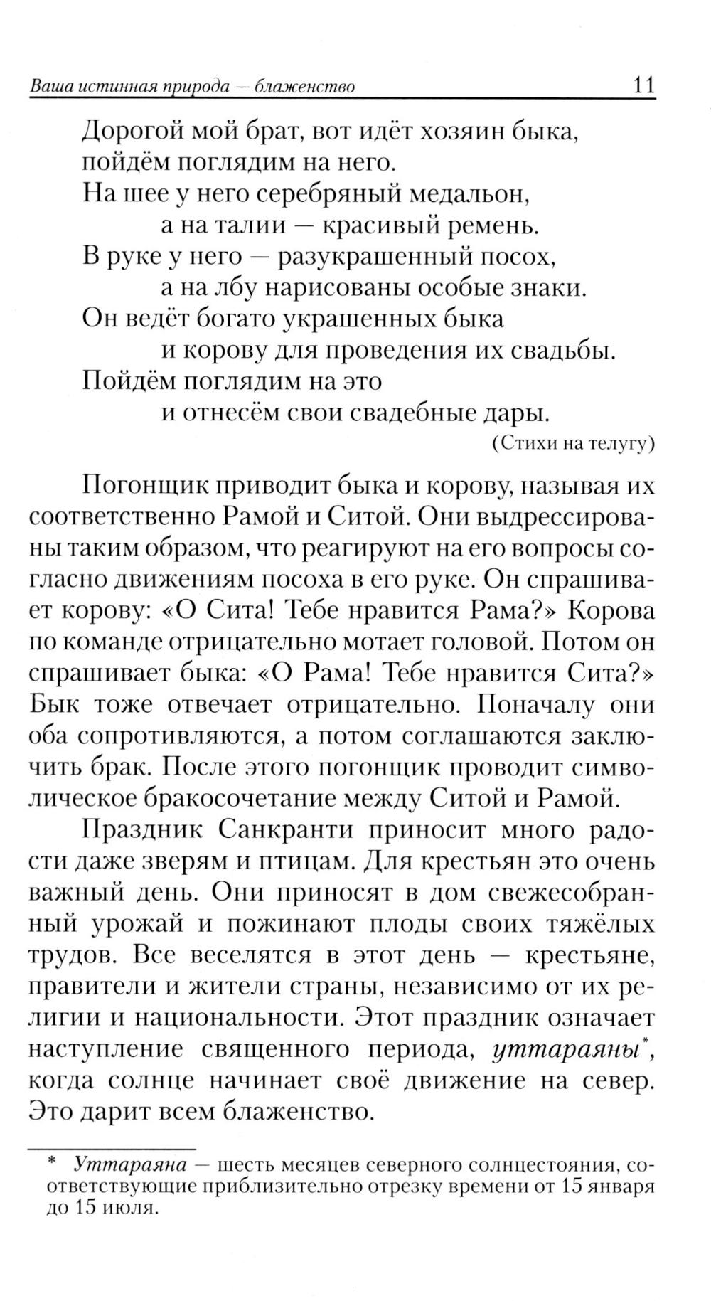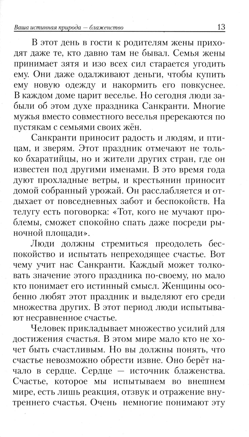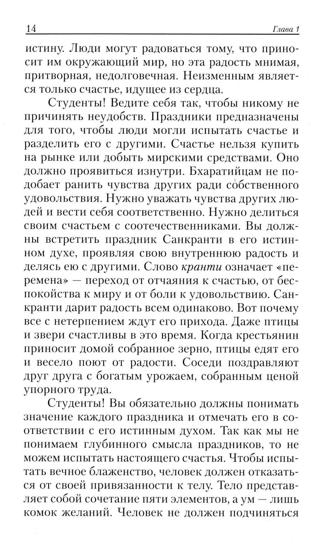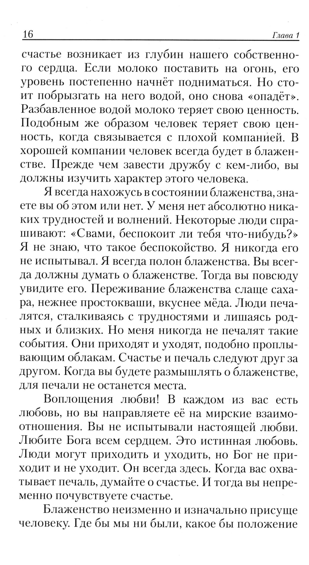Время - это основной фактор человеческой жизни. Человек должен осознать важность своей жизни. Не растрачивайте время понапрасну. Потерянное время - это потерянная жизнь. В человеческой жизни существуют три взаимосвязанных аспекта: мысли, поведение и результат. Каковы мысли, таково и поведение, а каково поведение, таков будет и результат. Хорошие действия дают хорошие результаты; плохие действия - плохие результаты. Это вечный закон. Настоящий человек тот, кто наделён состраданием. Все божественны, и нужно помогать всем, видя в них Бога. Постигший эту истину достигнет большого успеха в жизни. Никогда не проходите мимо тех, кто попал в беду, с кем случился несчастный случай - облегчите их страдания и окажите посильную помощь. Тогда сам Бог наполнит вас энергией. Искренний, вдумчивый духовный искатель найдёт множество божественных откровений на страницах этой книги.| Издательство | Амрита-Русь |