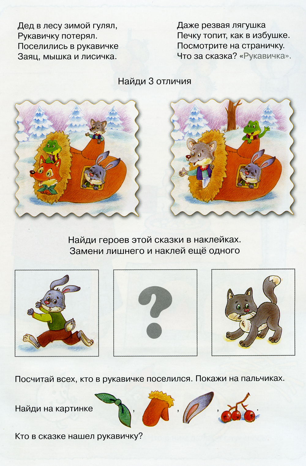 Представим себе Маму и Сыночка (или Папу и Дочку). Вот открыли они книжку, и просит Мама Сыночка (или Папа Дочку): - Найди героев этой сказки, мой милый. - Какой, мама? - А той, из которой эта картинка. Вот послушай стишок и угадай, как она называется! - Сравни две картинки. Найди три отличия. (Классика жанра!) - Приклей наклейки с героями. Из трёх героев даны только два, и то один из них явно потерялся! Заменим его и найдём недостающего. Для этого у нас целый лист наклеек. Там даже лишние есть. Используйте их по своему усмотрению! P.S. Мало того, оказывается, что если внимательно рассмотреть с малышом большую картинку на левой странице, то можно умудриться обнаружить 4 маленьких детали, на которые вначале мы даже не обратили внимания. Вспомните сюжет, ответьте на вопросы, посчитайте на пальчиках и обсудите мораль! Весёлых занятий!| Издательство | ИД Карапуз |