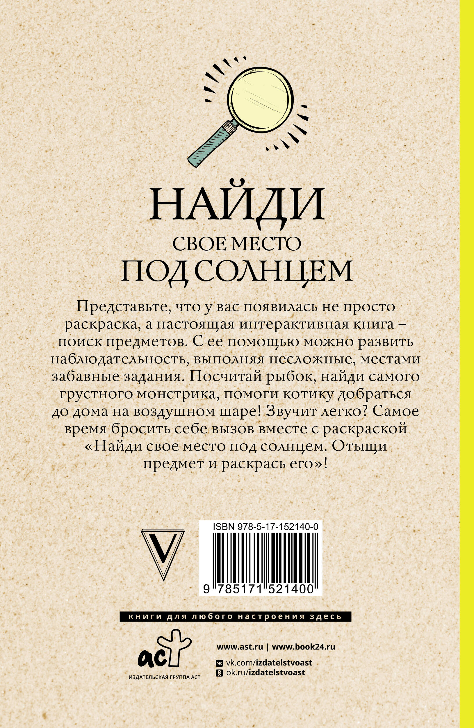 Посчитай рыбок, найди самого грустного монстрика, помоги котику добраться до дома на воздушном шаре! Звучит легко? Самое время бросить себе вызов вместе с раскраской "Найди свое место под солнцем. Отыщи предмет и раскрась его".| Издательство | ИЗДАТЕЛЬСТВО "АСТ" |