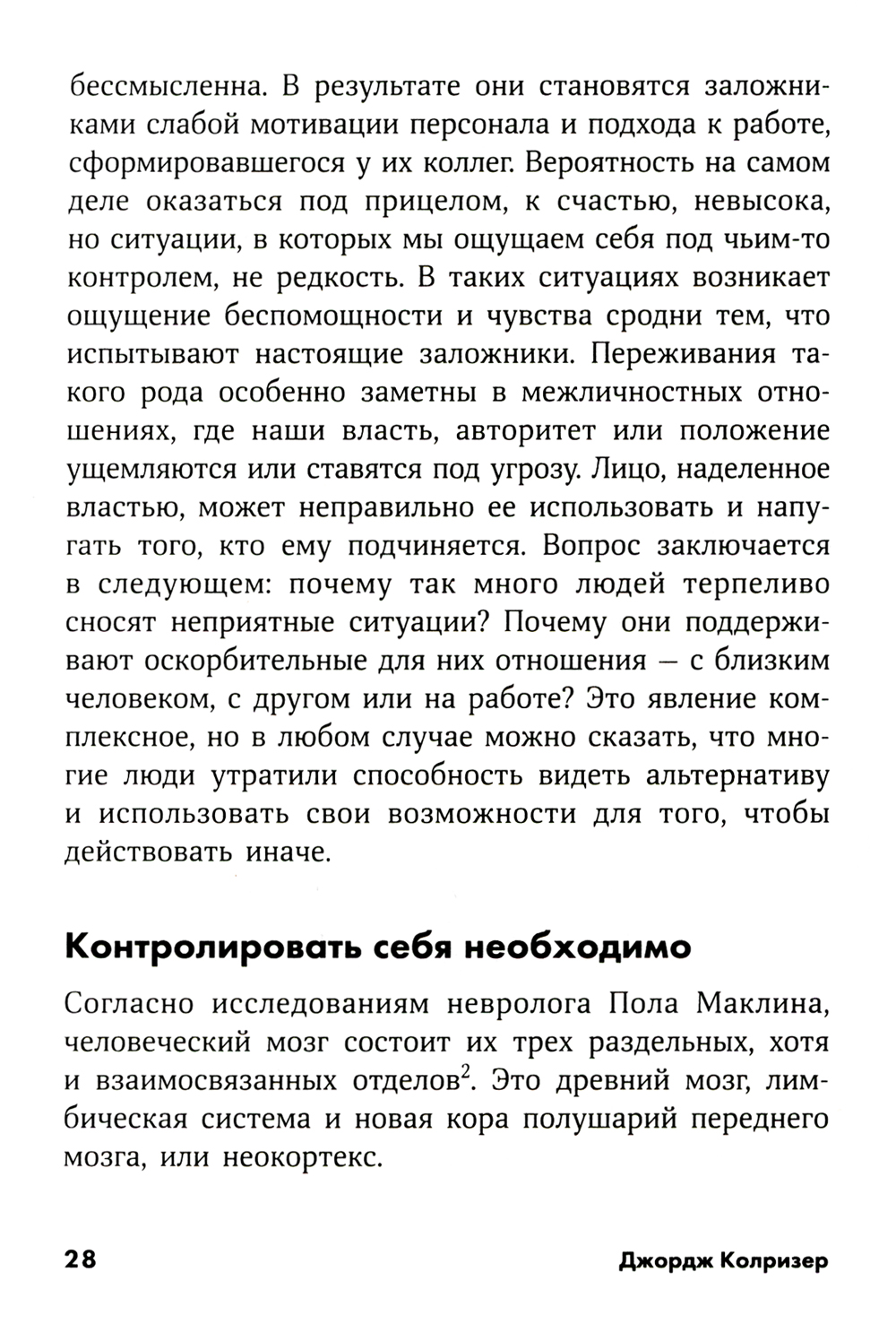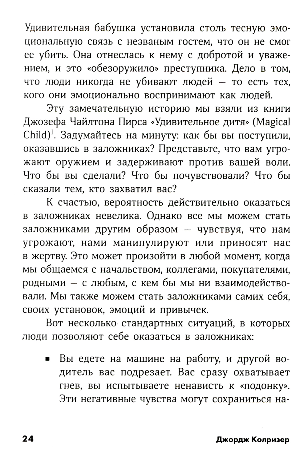 Вся наша жизнь пронизана конфликтами. Их принято избегать, но Джордж Колризер - специалист по психологии управления, консультант и бывший переговорщик - считает, что от конфликта отворачиваться нельзя. Только пройдя через него, можно разрешить сложные ситуации, возникающие в бизнесе и частной жизни. По терминологии Колризера «быть в заложниках» - значит чувствовать себя загнанным в ловушку, ощущать бессилие и беспомощность. И в этом случае можно с успехом использовать проверенные методы, применяемые в работе с захватчиками заложников. Для разрешения конфликта не следует прятать проблему - ее необходимо выявить и тщательно изучить. Никогда нельзя думать как заложник и смиряться с участью жертвы. Необходимо пользоваться огромными возможностями, заложенными в диалоге, и сотрудничать, опираясь на принцип взаимности. Ранее книга издавалась под названием «Не стать заложником».| Издательство | Альпина Паблишер |