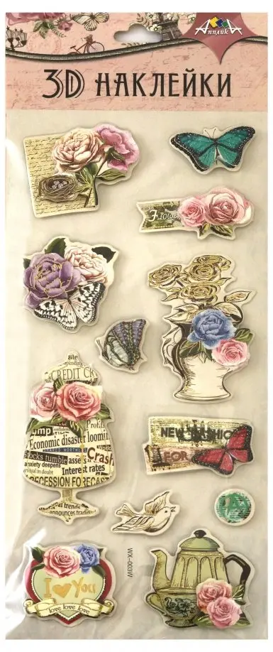 Объемные наклейки из нескольких слоев бумаги, украшены блестками и тиснением фольгой.