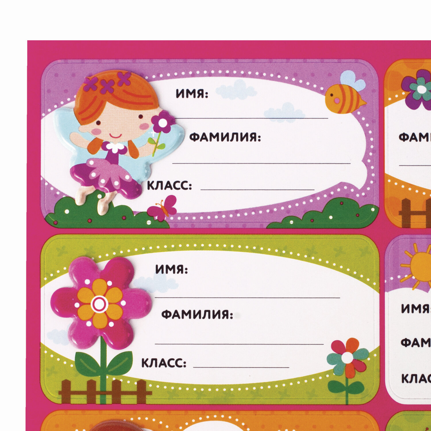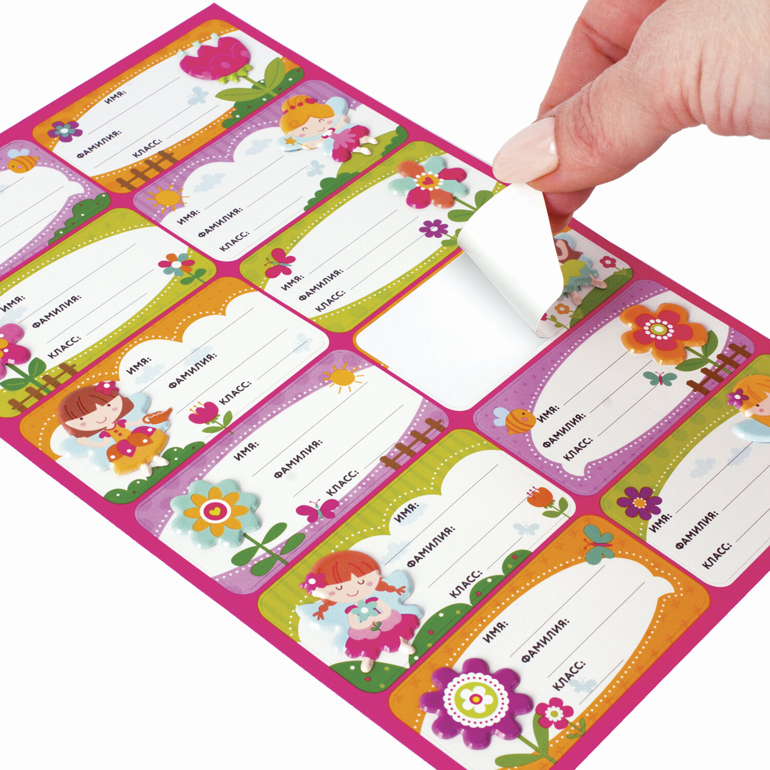 В наборе содержится 12 бумажных наклеек с объёмными элементами из мягкого пластика. На каждой наклейке предусмотрены линейки, на которых школьник может указать своё имя, фамилию и класс. Школьные наклейки - это не только удобный, но ещё и красивый способ индивидуализировать вещи ученика.