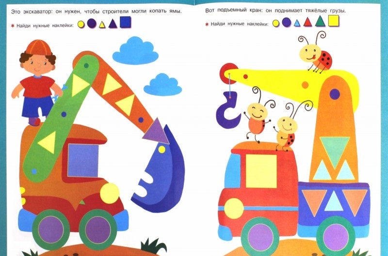 Как весело и интересно играть с наклейками! Можно составлять картинки из ярких разноцветных фигур, а заодно запоминать названия цветов и геометрических форм.