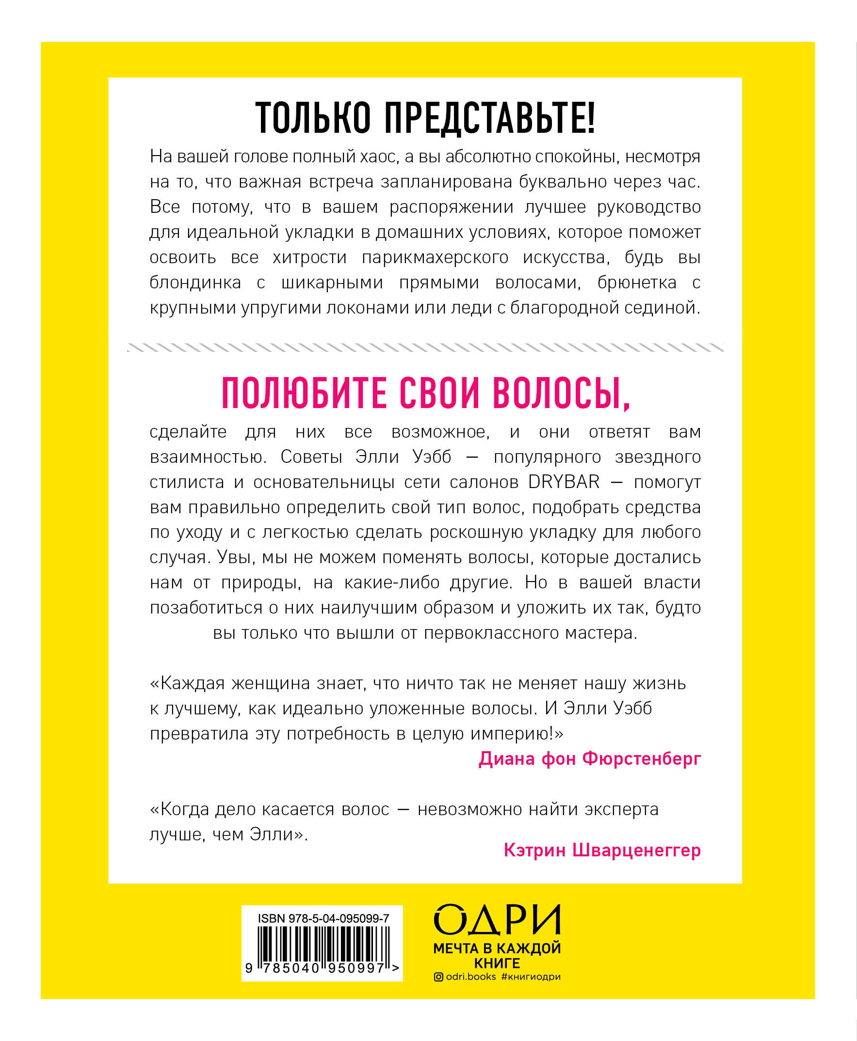 Волосы есть у всех. По крайней мере, у большинства из нас. Правда у всех они абсолютно разные. Нас так много: блондинка с шикарными прямыми волосами, брюнетка с крупными упругими локонами, леди с благородной сединой. Увы и ах, мы не можем поменять волосы, которые нам достались от природы, на какие-либо другие. Но в нашей власти уложить их так, как нам нравится, и позаботиться о них наилучшим образом. Полюбите свои волосы, сделайте для них все возможное, и они ответят вам взаимностью. Советы Элли Уэбб помогут вам правильно определить свой тип волос, подобрать средства по уходу и с легкостью сделать роскошную укладку для любого случая.| Издательство | ООО "Издательство "Эксмо" |