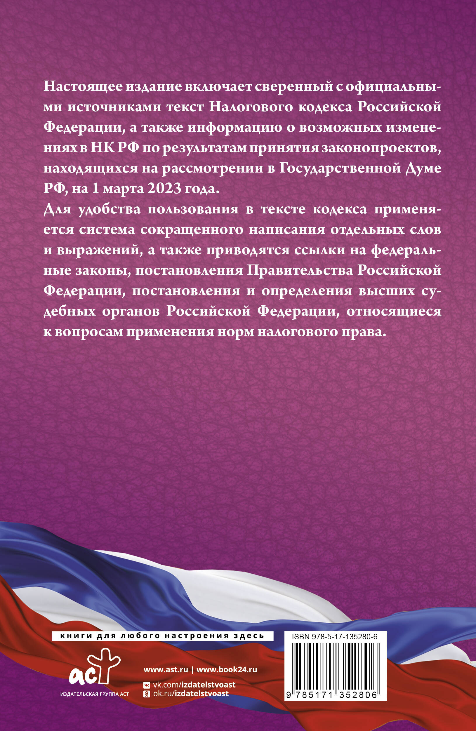 Настоящее издание включает сверенный с официальными источниками текст Налогового кодекса Российской Федерации, а также информацию о возможных изменениях в НК РФ по результатам принятия законопроектов, находящихся на рассмотрении в Государственной Думе РФ, на 1 марта 2023 года. Для удобства пользования в тексте кодекса применяется система сокращенного написания отдельных слов и выражений, а также приводятся ссылки на федеральные законы, постановления Правительства Российской Федерации, постановления и определения высших судебных органов Российской Федерации, относящиеся к вопросам применения норм налогового права.| Издательство | ИЗДАТЕЛЬСТВО "АСТ" |