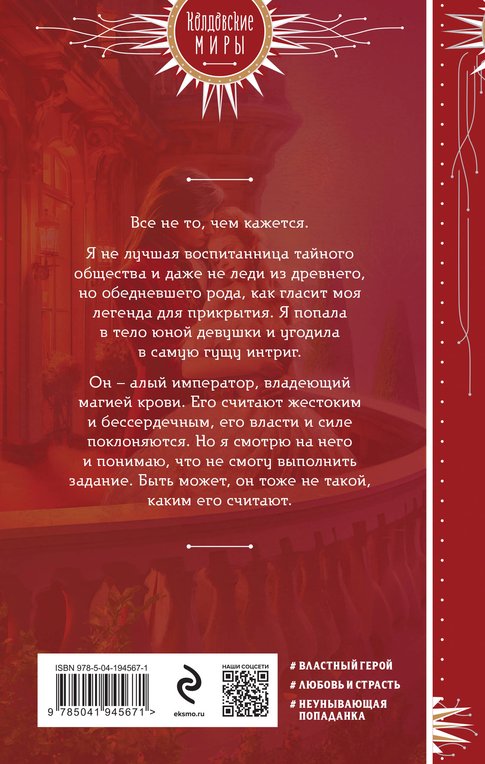 Все не то, чем кажется. Я не лучшая воспитанница тайного общества и даже не леди из древнего, но обедневшего рода, как гласит моя легенда для прикрытия. Я попала в тело юной девушки и угодила в самую гущу интриг. Он - алый император, владеющий магией крови. Его считают жестоким и бессердечным, его власти и силе поклоняются. Но я смотрю на него и понимаю, что не смогу выполнить задание. Быть может, он тоже не такой, каким его считают. Пять причин купить: 1. Взрослая, сообразительная, уверенная в себе героиня. 2. Невероятно притягательный император и химия между ним и нашей попаданкой. 3. Загадочное яйцо... Здесь точно есть тайна! 4. Хищные цветочки, которые могут сделать кусь!)) 5. Интересная система магии света и тьмы.| Издательство | ООО "Издательство "Эксмо" |