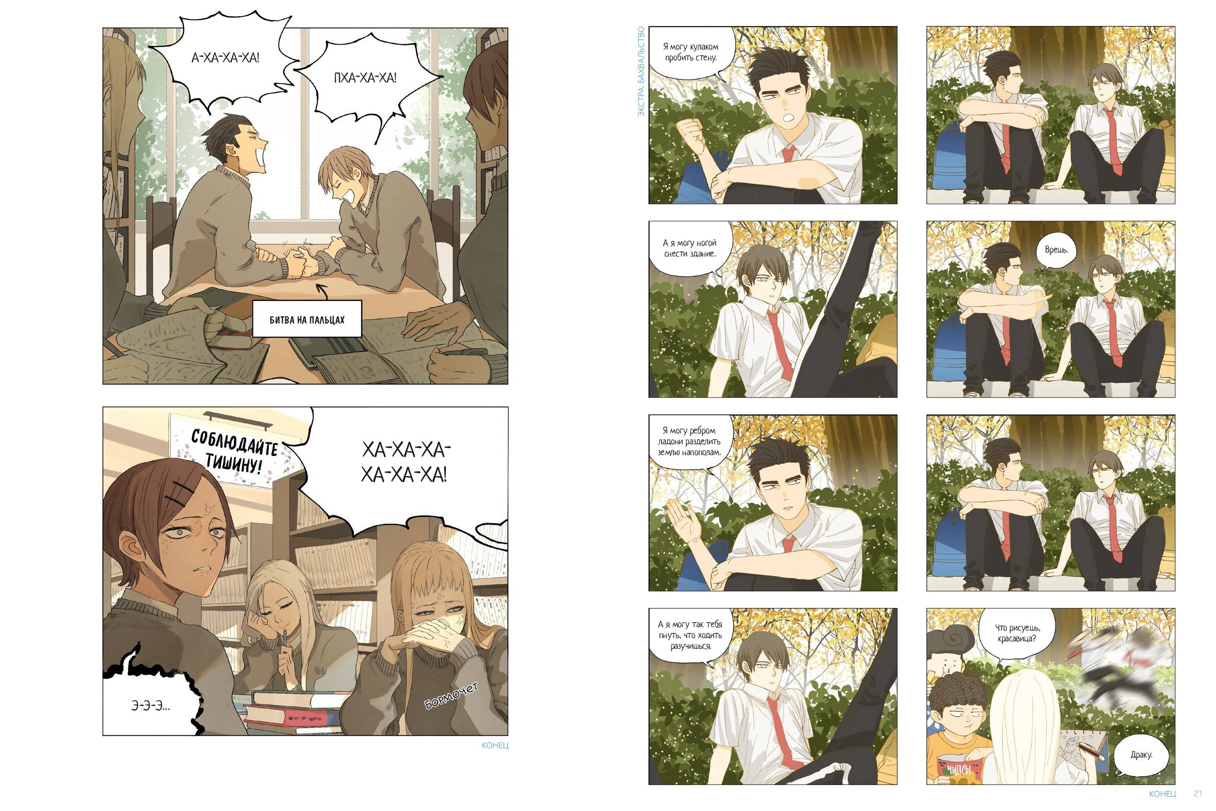 "Что есть молодость? Стыдливость, бунтарство, самоуверенность, избыток самоанализа и..." Нань Хао и Шан Фэн - лучшие друзья, которые живут на полную катушку. Невероятно пафосная, местами абсурдная и очень забавная история о том, как здорово найти человека, с которым ты на одной волне. Пусть и очень дурацкой. От автора: Когда начинал рисовать, даже не мечтал о подобном, просто делал то, что приносило удовольствие. Я и не думал, что соберу аудиторию сыновей, которые, словно под микроскопом, будут рассматривать любую мелочь. Поэтому я так ценю выход каждой главы, ведь взаимодействие с читателями - моя мотивация творить. Находя запрятанные пасхалочки, в которых даже может не быть особого смысла, читатели интерпретируют их по-своему, из-за чего история приобретает совсем другой смысл. Мне это очень нравится! И чтобы моя жизнь оставалась такой же, я соберусь с духом, буду есть, умываться, спать, радоваться жизни, а вы сможете и дальше читать мои комиксы. Фишки книги: - Внутри вас ждет сюрприз - открытка от Студии. - Забавная история для всех фанатов азиатской литературы и "Студии Мосспака". Для кого эта книга: Для аудитории Young Adult. Для всех любителей комиксов. Для фанатов азиатской литературы. Для фанатов "Студии Мосспака".| Издательство | МАНН, ИВАНОВ И ФЕРБЕР ООО |