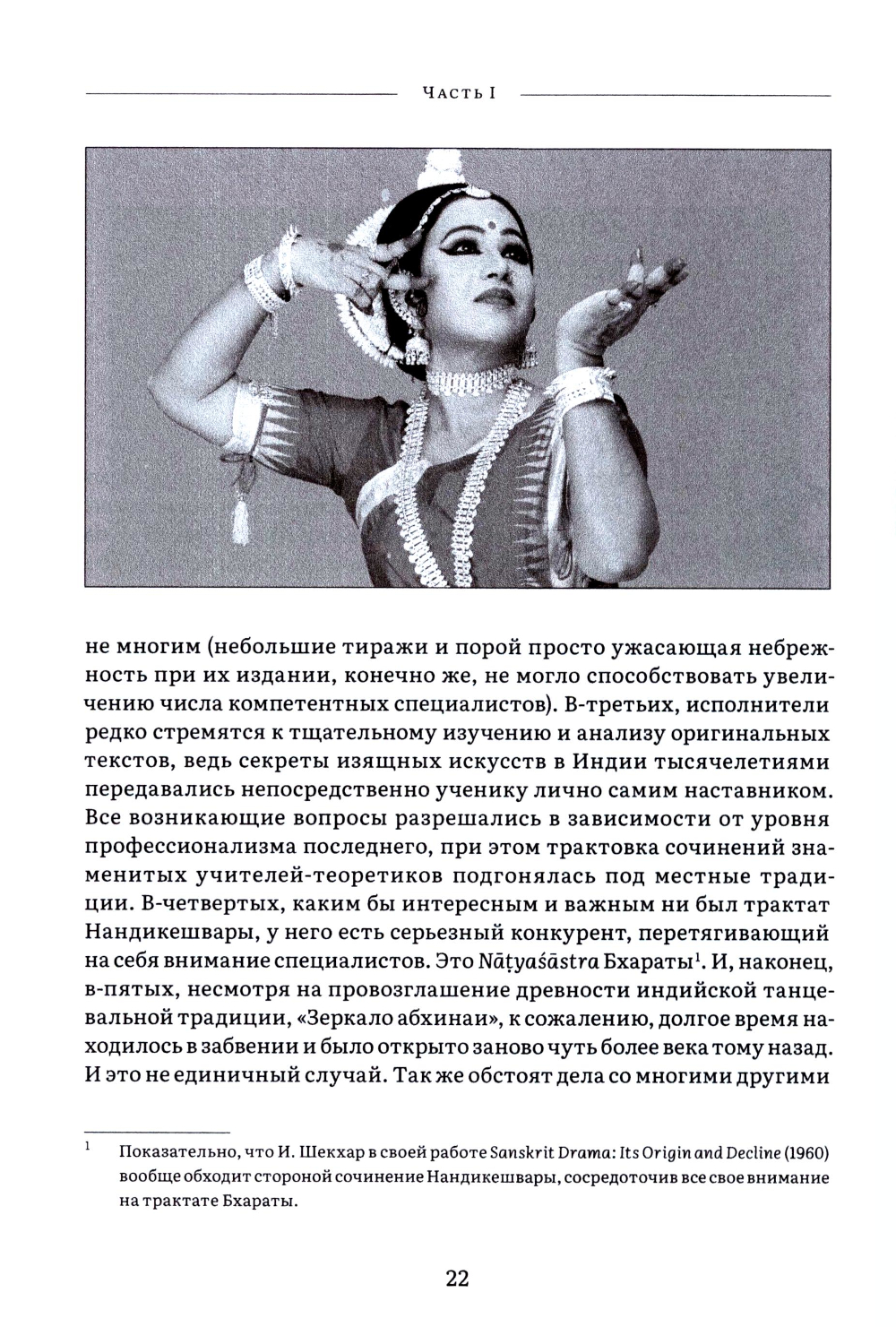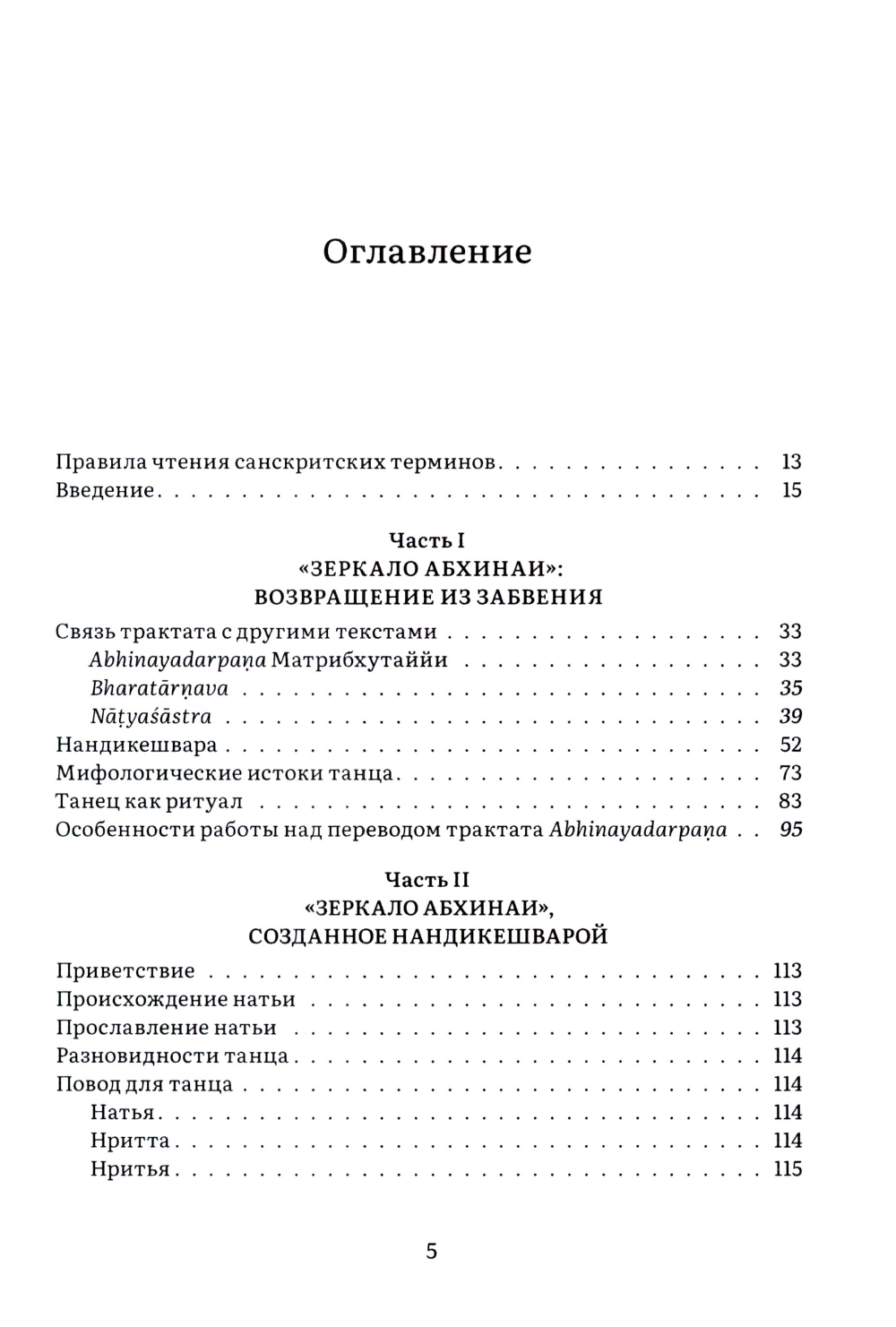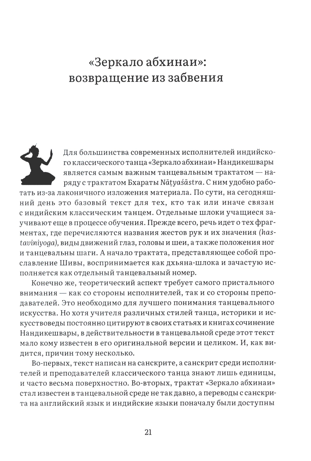 Abhinayadarpana, или «Зеркало абхинаи», - древнеиндийский трактат о танцевальном искусстве, автором которого является Нандикешвара. В трактате описываются движения головы, шеи, глаз, говорится о жестах рук, об их значениях и правилах использования, дается описание положений и движений ног (шаги, походки, прыжки и пр.), рассказывается о качествах танцовщицы и ножных колокольчиков, о видах танца и абхинаи, о происхождении ритуального танца. Данная книга представляет собой не только перевод «Зеркала абхинаи» на русский язык, выполненный с санскритского оригинала, но также включает критическую часть, в которой речь идет о важных для понимания трактата аспектах индийского танцевального искусства.| Издательство | Изд. Ганга |