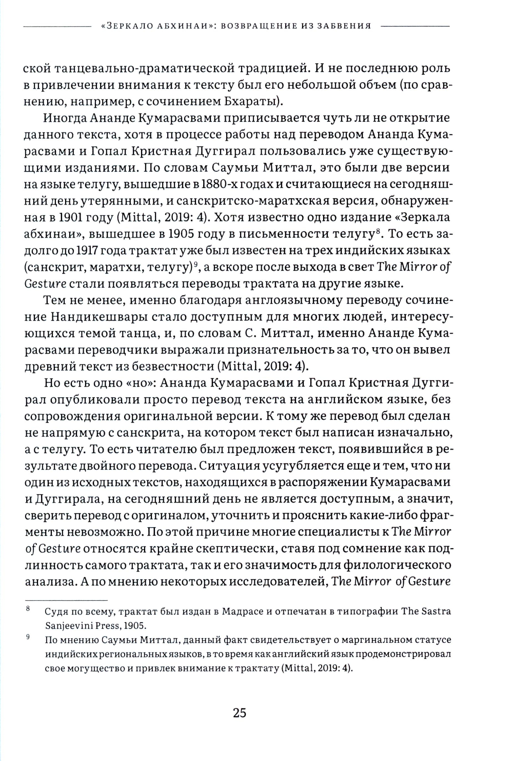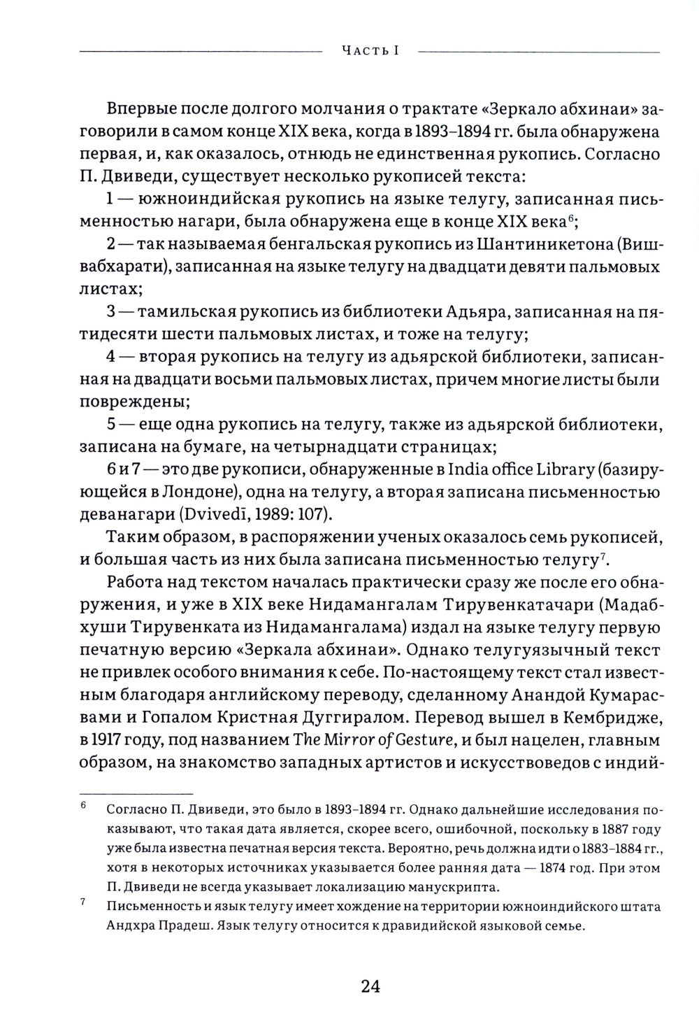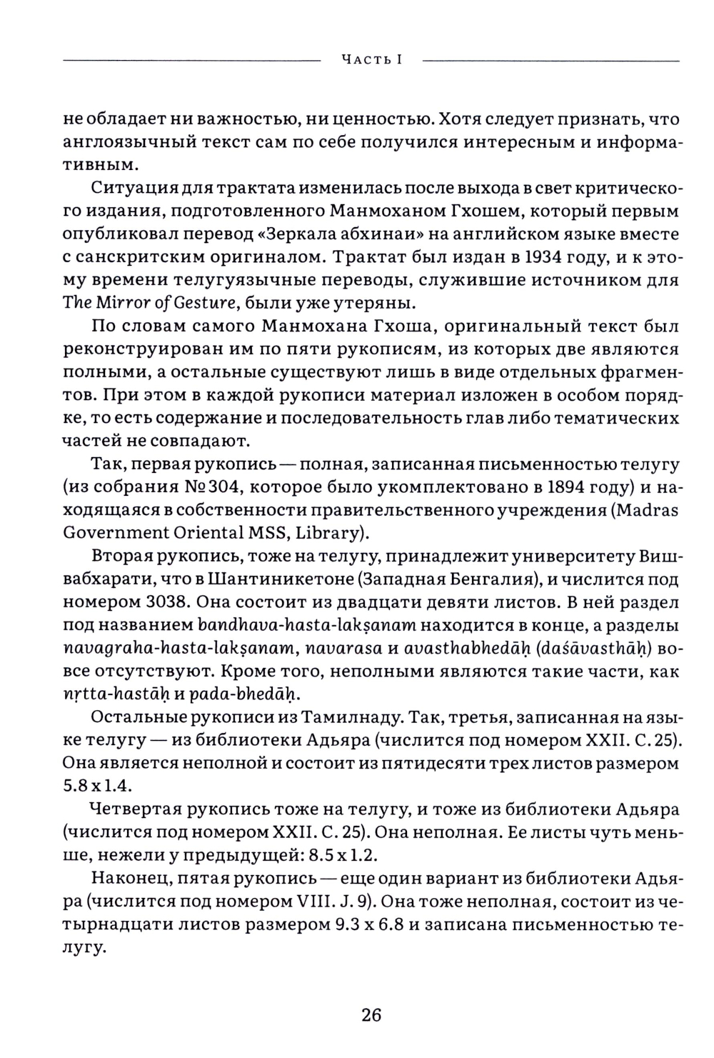 Abhinayadarpana, или «Зеркало абхинаи», - древнеиндийский трактат о танцевальном искусстве, автором которого является Нандикешвара. В трактате описываются движения головы, шеи, глаз, говорится о жестах рук, об их значениях и правилах использования, дается описание положений и движений ног (шаги, походки, прыжки и пр.), рассказывается о качествах танцовщицы и ножных колокольчиков, о видах танца и абхинаи, о происхождении ритуального танца. Данная книга представляет собой не только перевод «Зеркала абхинаи» на русский язык, выполненный с санскритского оригинала, но также включает критическую часть, в которой речь идет о важных для понимания трактата аспектах индийского танцевального искусства.| Издательство | Изд. Ганга |