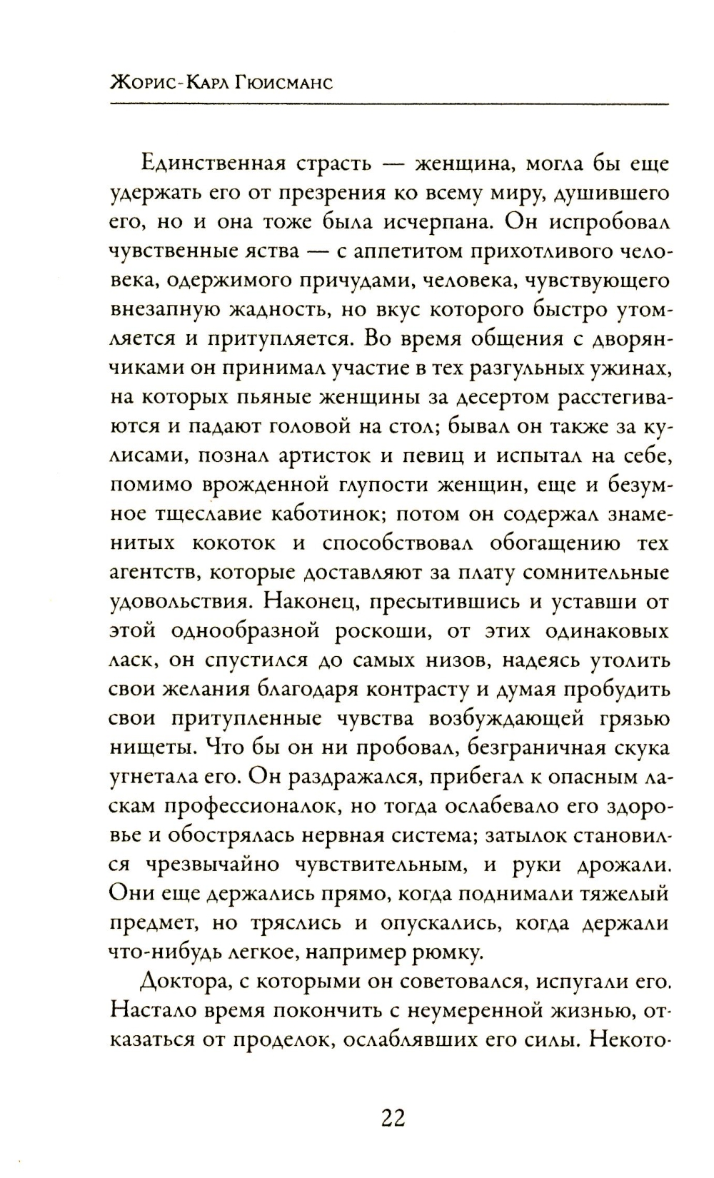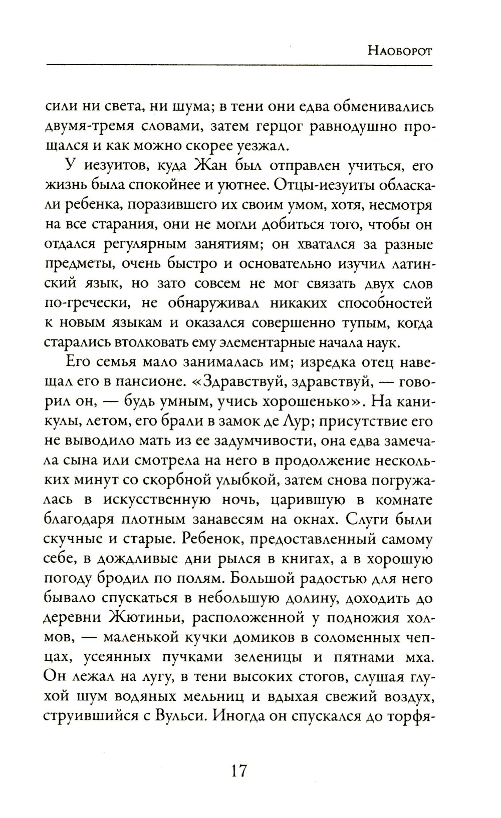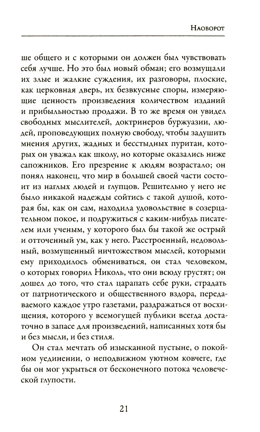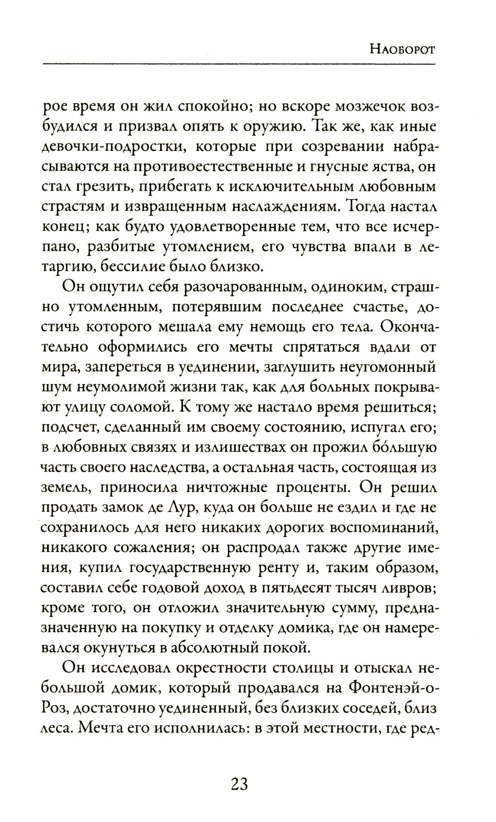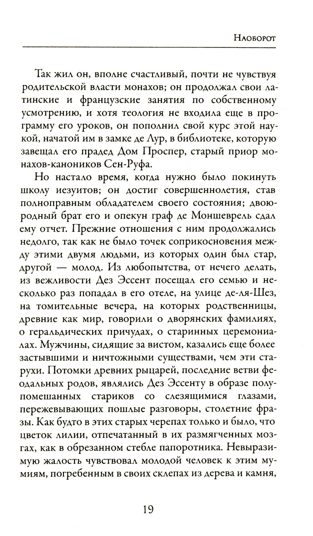 Роман «Наоборот» (1884) считается «библией декаданса». Соврменники и потомки по-разному относились к экспериментальному роману Жориса Гюисманса, но в определенных европейских кругах рубежа XIX и XX веков книга стала настольной. Многие «находки» романа получили широкое распространение в европейской литературе - антигерой-эстет, разочарованный мещанскими нравами, отсутствие сюжета, гипертекстуальность (отсылки к Малларме с Верленом, к Апулею и Эдгару По) и болезненное наслаждение искусством и красотой. Именно эту книгу читает Дориан Грей, к эстетике этого произведения обращаются русские символисты, отсылки к нему мы видим в современном литературном постмодерне. Это книга, в которой жизнь подражает искусству, а не наоборот.| Издательство | Рипол Классик |