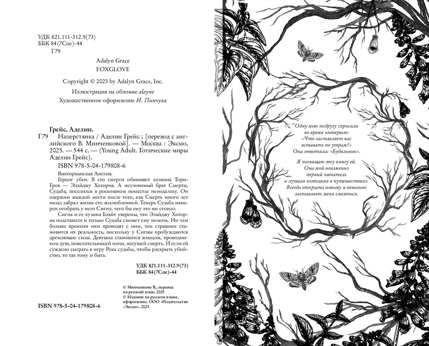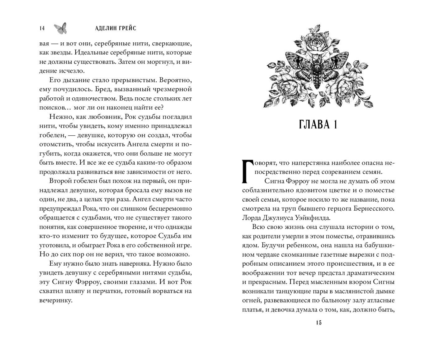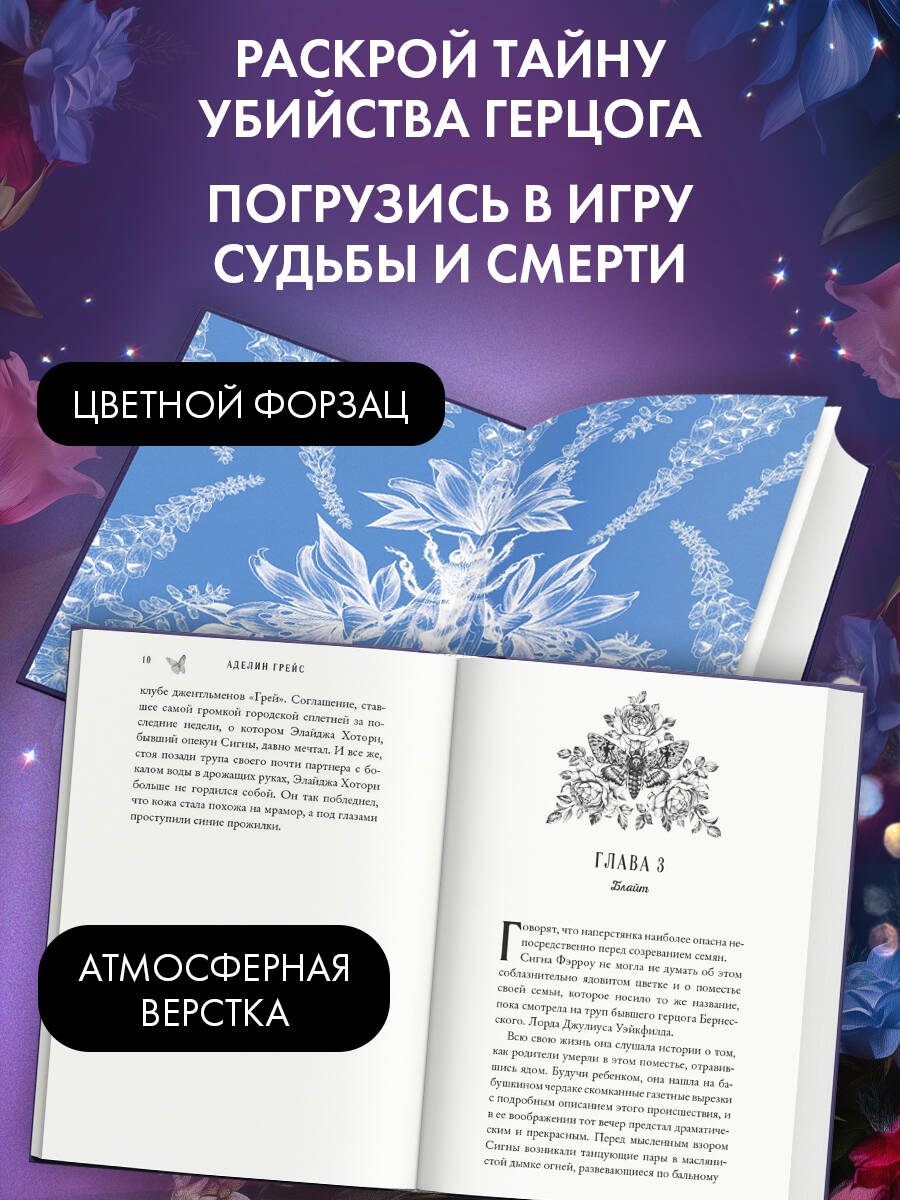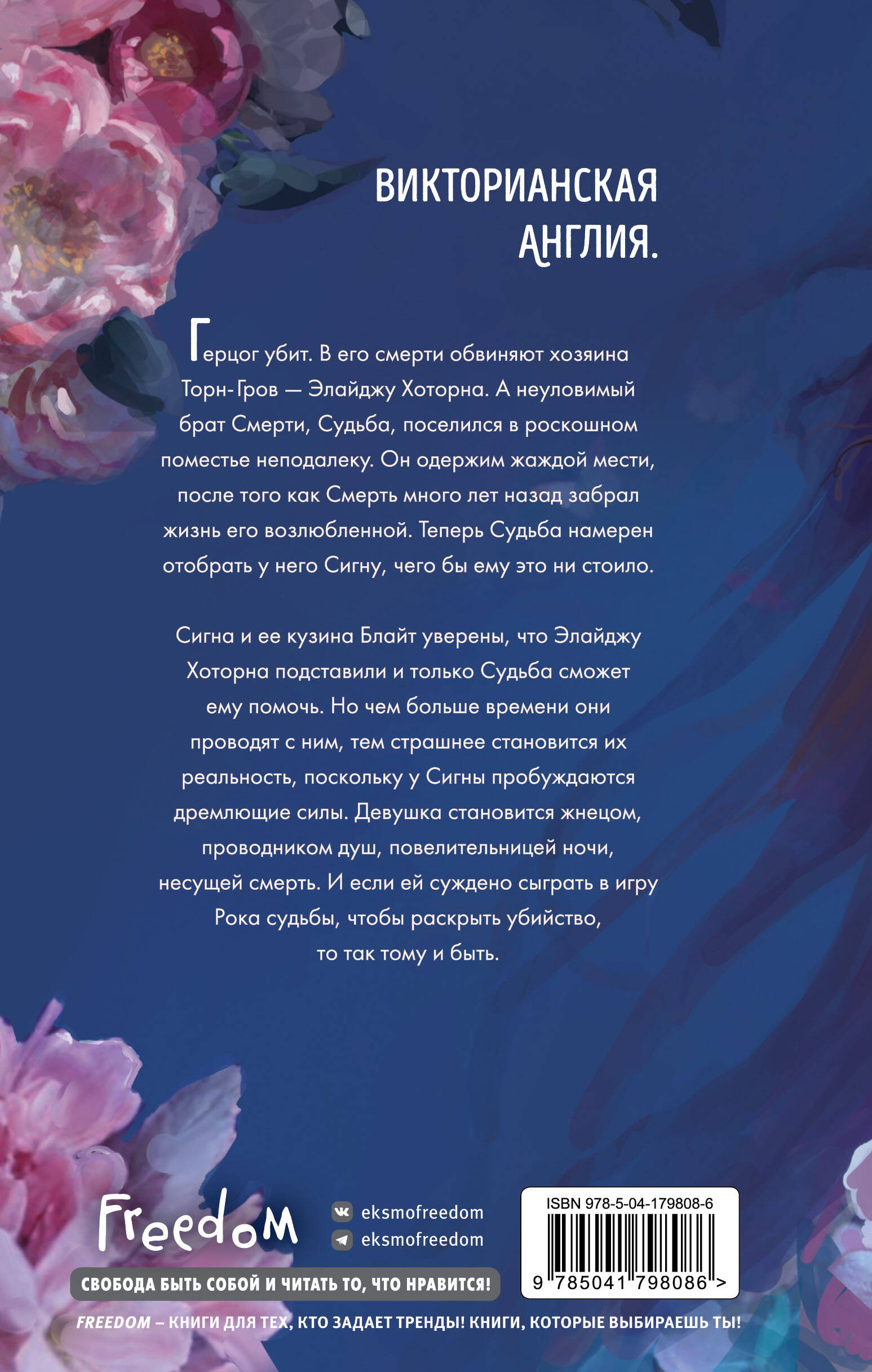 Долгожданное продолжение готического фэнтези «Белладонна» автора бестселлеров New York Times Аделин Грейс, в котором Сигна и Смерть сталкиваются со сверхъестественным врагом, решившим их разлучить. Герцог убит. В его смерти обвиняют хозяина Торн-Гров - Элайджу Хоторна. А неуловимый брат Смерти, Судьба, поселился в роскошном поместье неподалеку. Он одержим жаждой мести после того, как Смерть много лет назад забрал жизнь его возлюбленной. Теперь Судьба намерен отобрать у него Сигну, чего бы ему это ни стоило. Сигна и ее кузина Блайт уверены, что Элайджу Хоторна подставили и только Судьба сможет ему помочь. Но чем больше времени они проводят с ним, тем страшнее становится их реальность, поскольку у Сигны пробуждаются дремлющие силы. Девушка становится жнецом, проводником душ, повелительницей ночи, несущей смерть. И если ей суждено сыграть в игру Рока судьбы, чтобы раскрыть убийство, то так тому и быть. Готическое магическое фэнтези с соблазнительной историей любви и мести. Декадентский опасный мир с темными и завораживающими тайнами, предательством, проклятиями, интригами и неожиданной концовкой. Иллюстрация на обложке художницы alayne.