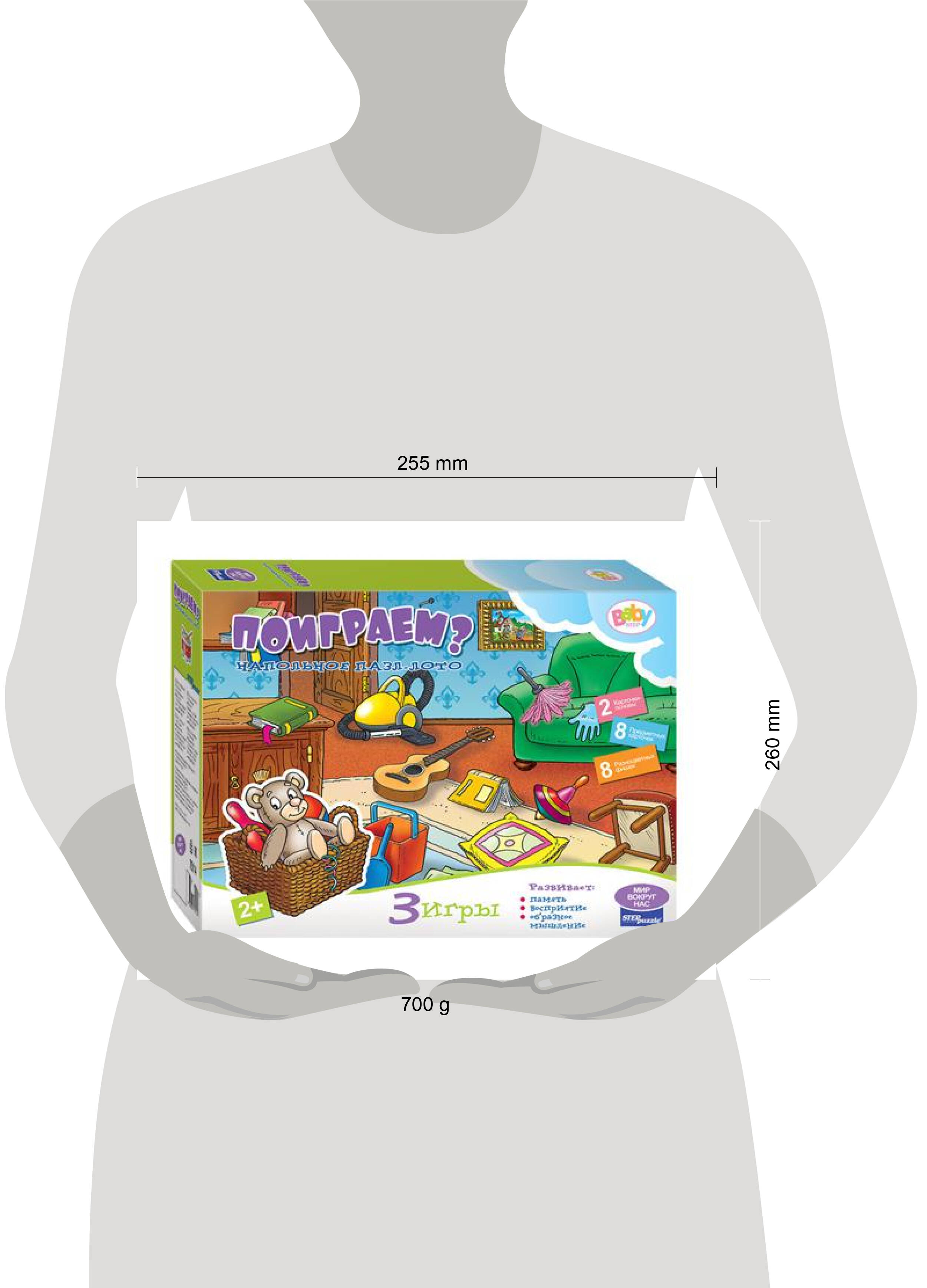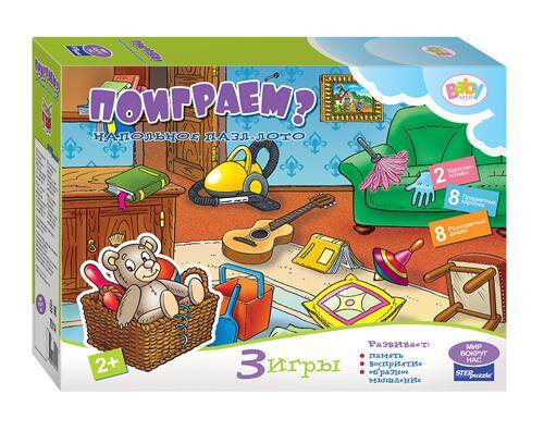 Пазл-лото "Поиграем?" познакомит с игрушками в игровой комнате и поможет навести порядок в гостиной. Развивает память, восприятие и образное мышление. 3 варианта игры: "Найди предметы", "Что изменилось?", "Отвечай-ка!". В комплекте: 2 карточки-основы, 8 предметных карточек, сюжетная картинка и 8 фишек. Размер картинки: 1050x680 мм. Возраст: 2+.| Издательство | Степ Пазл ЗАО |