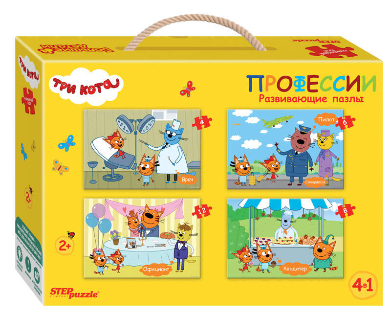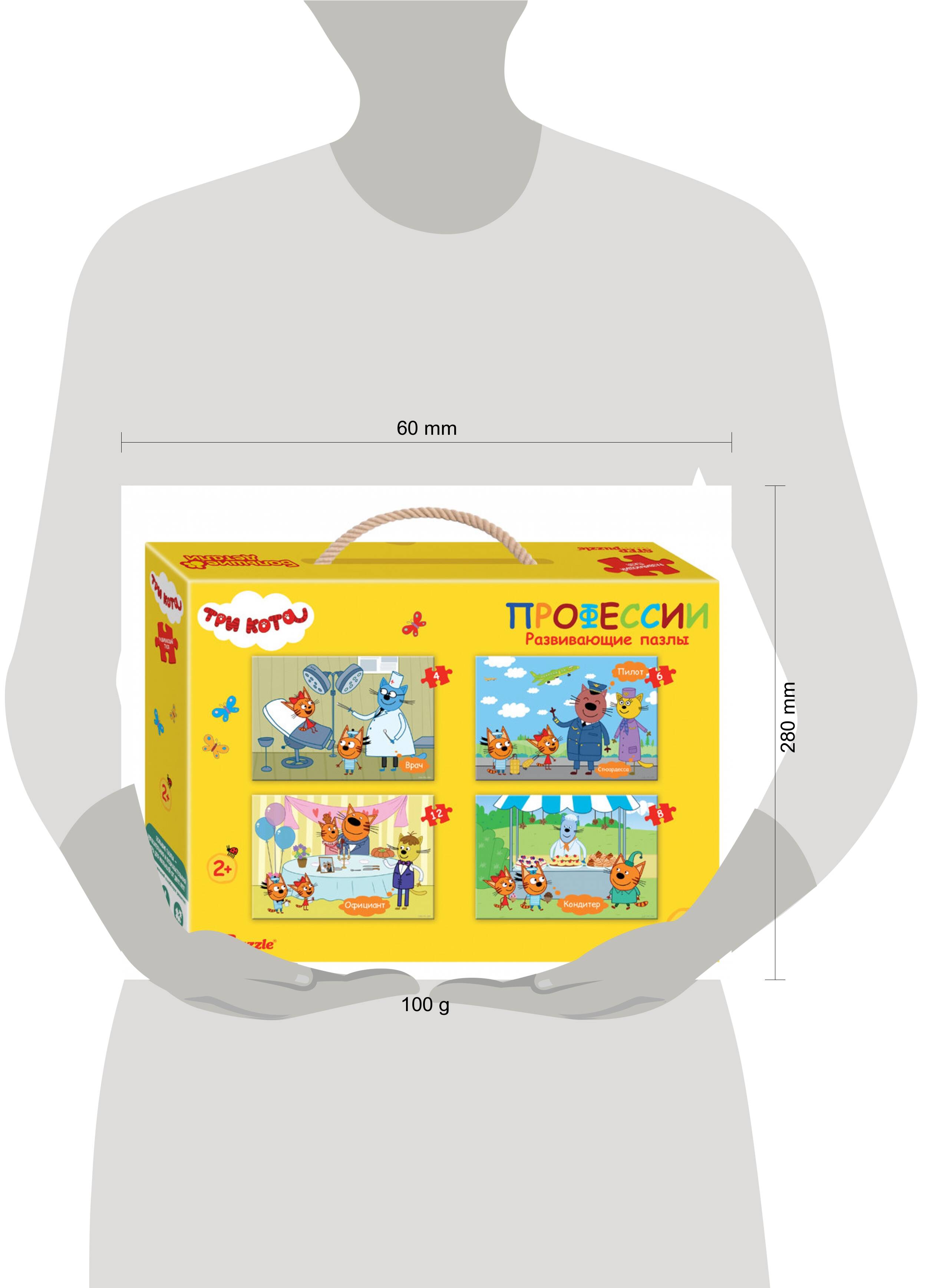 Пазлы из набора "Три кота" можно собирать прямо на полу. Простые яркие картинки, оригинальная вырубка и любимые герои помогут достичь результата. На картинках пазлов мы видим представителей разных профессий. Все изображения повторяют сцены из любимого мультфильма. С пазлами ребёнок узнает, чем занимаются врач, пилот и стюардесса, официант и кондитер. Напольные пазлы способствуют развитию: - внимания; - мелкой моторики; - сенсорных навыков; - ассоциативного мышления. Что в наборе? В наборе вы найдете 30 деталей разных размеров (размеры деталей от 5,7 х 5,7 см до 11,5 х 8 см). Как играть? Задача игрока - найти и соединить в одну цельную картинку пазлы, подходящие друг другу по смыслу. Всего ребенок должен собрать 4 картинки, состоящие из 4, 6, 8 и 12 пазлов. Размер одной собранной картинки - 23,2 х 16 см. Для кого? Подойдет для малышей от 2 лет. Материал. Качественный плотный картон. В серии "Напольные пазлы. Средние": - Напольный пазл "Король Лев" (Disney) - Напольный пазл "Праздники. Тима и Тома" - Напольный пазл "Лунтик" - Напольный пазл "Малышарики" - Напольный пазл "Холодное сердце-2" - Напольный пазл "Спешим на помощь" - Напольный пазл "Дикие животные" - Напольный пазл "Морские жители"- Напольный пазл "Насекомые" - Напольный пазл "Барбоскины"| Издательство | Степ Пазл ЗАО |