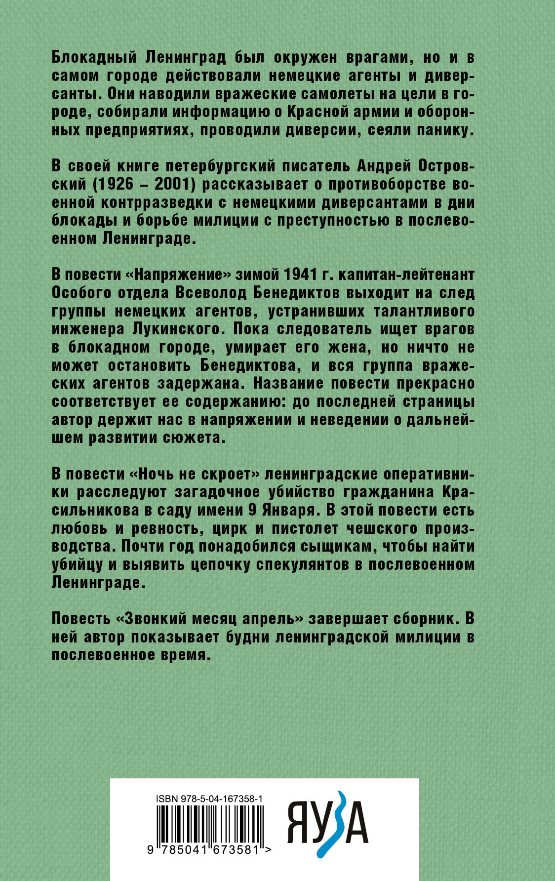 Блокадный Ленинград был окружен врагами, но и в самом городе действовали немецкие агенты и диверсанты. Они наводили вражеские самолеты на цели в городе, собирали информацию о Красной Армии и оборонных предприятиях, проводили диверсии. В своей книге петербургский писатель Андрей Островский (1926-2001) рассказывает о противоборстве военной контрразведки с немецкими диверсантами в дни блокады и борьбе милиции с преступностью в послевоенном Ленинграде. В повести «Напряжение», зимой 1941 г., в блокадном городе сотрудники особого отдела расследуют самоубийство военинженера 3-го ранга Евгения Лукинского, трудившегося на оборонном заводе. Рядом с его телом найдена немецкая ракетница и гильзы. Следователи предполагают, что самоубийца с помощью ракетницы наводил самолеты противника во время бомбардировок. Один из следователей, капитан-лейтенант Особого отдела Всеволод Бенедиктов, был знаком с Лукинским. В ходе обыска Бенедиктов находит дневник самоубийцы, после знакомства с которым начинает сомневаться в добровольном уходе из жизни Лукинского. Распутывая преступление, Бенедиктов выходит на след группы немецких агентов, устранивших талантливого инженера. Пока следователь ищет врагов в блокадном городе, умирает его жена, но ничто не может остановить Бенедиктова, и вся группа вражеских агентов была задержана. Название повести прекрасно соответствует ее содержанию, до последней страницы автор держит нас в напряжении и неведении о дальнейшем развитии сюжета. В повести «Ночь не скроет» ленинградские оперативники расследуют загадочное убийство гражданина Красильникова в саду «9-го января». В этой повести есть любовь и ревность, цирк и пистолет чешского производства. Почти год понадобился сыщикам, чтобы найти убийц и выявить цепочку спекулянтов в послевоенном Ленинграде. Повесть «Звонкий месяц апрель» завершает сборник. В ней автор показывает будни ленинградской милиции в послевоенное время.