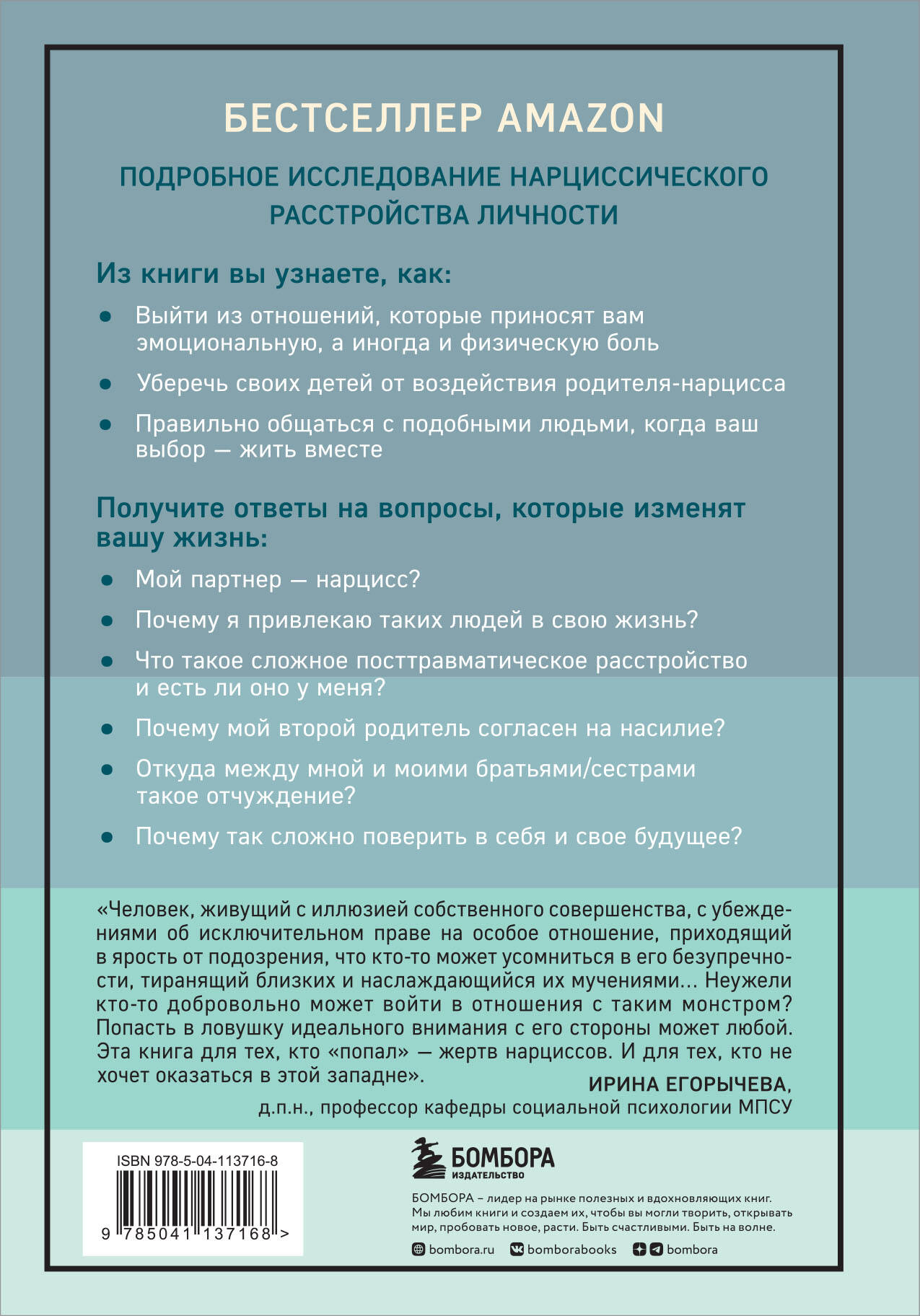 Бестселлер Amazon! Подробное исследование нарциссического расстройства личности. Вы узнаете, как: Выйти «выжившим» из отношений, которые приносят эмоциональную, а иногда и физическую боль. Уберечь своих детей от воздействия родителя-нарцисса. Правильно общаться с подобными людьми, когда ваш выбор - жить вместе. Получите ответы на вопросы, которые изменят вашу жизнь: • Мой партнер нарцисс? • Почему я привлекаю таких людей в свою жизнь? • Что такое сложное посттравматическое расстройство и есть ли оно у меня? • Почему мой второй родитель согласен на насилие? • Откуда между мной и моими братьями/сестрами такое отчуждение? • Почему так сложно поверить в себя и свое будущее?| Издательство | ООО "Издательство "Эксмо" |