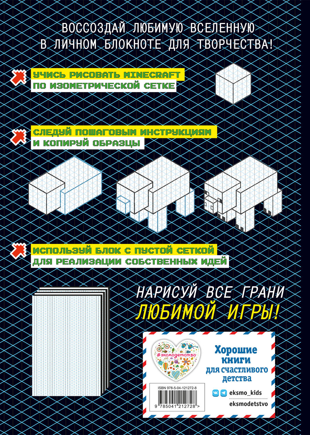 Теперь у тебя есть свой личный блокнот для творчества! Рисуй любимых героев Minecraft, смотри на гайды и повторяй картинки, а когда освоишь рисование, создавай свои собственные сценки и персонажей! Перед тобой уникальный блокнот с изометрической сеткой. Всё, что тебе нужно - это снять фантазию с тормозов и строить, строить, строить - штрих за штрихом, блок за блоком - возводить свою собственную Вселенную Minecraft! Не теряй времени - открой свой личный квест по рисованию!| Издательство | ООО "Издательство "Эксмо" |