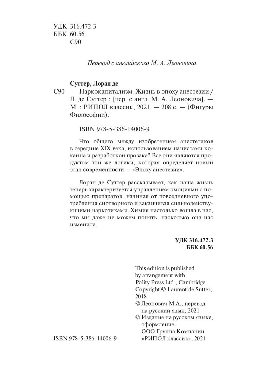 Что общего между изобретением анестетиков в середине XIX века, использованием нацистами кокаина и разработкой прозака? Все они являются продуктом той же логики, которая определяет новый этап современности - «Эпоху анестезии». Лоран де Суттер рассказывает, как наша жизнь теперь характеризуется управлением эмоциями с помощью препаратов, начиная от повседневного употребления снотворного и заканчивая сильнодействующими наркотиками. Химия настолько вошла в нас, что мы даже не можем понять, насколько она нас изменила.| Издательство | Рипол Классик |